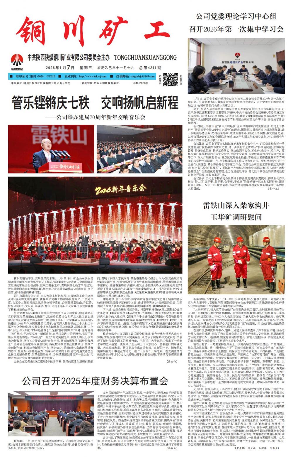 管乐铿锵颂华诞,交响激昂向未来。1月4日,铜川矿业公司庆祝建局70周年新年交响音乐会在矿工俱乐部隆重举行,此次音乐会由铜煤职工组成的管乐团全程演绎,以职工管乐之声,奏响铜煤七秩芳华再出发,骏彩星驰向未来的铿锵乐章,用交响之音讴歌劳动伟大、创造光荣、文化自信、奋斗图强的精神气象。铜川市副市长刘正旺,市人大副主任赵雅玲,市政协副主席王晓刚及市、区县相关领导嘉宾,陕煤集团党群工作部部长梅方义,工会副主席、女工委主任石秀云及兄弟单位领导嘉宾,公司领导雷铁山、许江涛、权恒、邢彦民、文永兵、李满平、曹伟,公司干部职工及家属代表共同观看了精彩纷呈的音乐会。公司党委书记、董事长雷铁山在致辞中代表公司党政,向长期关心支持铜煤改革发展的上级部门、兄弟单位及社会各界友人致以衷心感谢,向为企业建设发展辛勤付出的全体干部职工及家属致以崇高敬意。他指出,2025年作为铜煤建局70周年,公司深入贯彻党的二十大和二十届历次全会精神,坚决落实中省市和陕煤集团决策部署,深化拓展“三个年”活动,深入践行“四种经营理念”,紧扣“协同增效年”主题,充分发扬“三特”精神,于攻坚克难中砥砺前行,在承压奋进中勇于担当,书写了铜煤发展的新答卷。2026年是“十五五”开局关键之年,铜煤人将以七秩荣光为新起点,坚守初心使命,践行责任担当,厚植陕煤集团“四种经营理念”,坚守安全稳定环保廉洁底线,持续推动煤炭主业做精做优、非煤产业创新创效,积极培育新质生产力,坚定信心、勇毅前行,拿出跃马扬鞭的勇气,激发万马奔腾的活力,保持马不停蹄的干劲,奋力打造资源型企业转型发展的典范、改革创新的标杆,为陕煤集团创建世界一流企业、为地方经济社会发展作出新的更大贡献。音乐会在经典曲目《红旗颂》中拉开序幕,激昂的旋律如旗帜引领航向,奏响了铜煤人忠诚向党、砥砺奋进的时代强音。作为《唱支山歌给党听》歌词诞生地,交响管乐版的这首经典红歌深情婉转,传递着铜煤儿女不忘初心、感恩奋进的赤子情怀,引发全场强烈共鸣。《从三秦走向世界》展现了陕煤人深耕产业、逐梦一流的豪情壮志,《山丹丹开花红艳艳》以浓郁的陕北风情致敬红色根脉,《红星歌》《游击队歌》等曲目带领观众重温烽火岁月,缅怀革命先烈。中场时段,由下石节矿、陈家山矿等基层单位文艺骨干编排的音乐快板《铜煤风骨耀华夏》精彩上演,通过节奏明快、内容鲜活的表演,生动展现了铜煤人扎根矿山、拼搏奉献的精神风貌,赢得阵阵掌声。下半场,音乐会精彩持续升级。肖斯塔科维奇的《第二圆舞曲》旋律优美舒展,《单簧管波尔卡》活泼流畅、节奏跳跃,《桂河大桥进行曲》复刻经典电影中的人性光辉,《西班牙斗牛士进行曲》以明亮小号奏响昂扬斗志,《蓝色多瑙河圆舞曲》流淌着跨越时空的浪漫,《我的太阳》致敬千尺井下的平凡劳动者。最后,在指挥引领下,《拉德斯基进行曲》《康康舞曲》的欢快节奏点燃全场,音乐会在全体大合唱《歌唱祖国》的嘹亮歌声中圆满落幕。整场音乐会由公司职工管乐团全程演绎,红色经典与世界名曲交相辉映,管乐交响与职工风采完美融合,既传承了铜煤70年文化积淀,又展现了新时代国企职工的精神气象。不仅为广大干部职工带来了一场高水平的艺术盛宴,更凝聚了全公司上下不忘初心、勇毅前行的磅礴力量。大家纷纷表示,将以此次音乐会为契机,在新的一年,把激昂的旋律转化为干事创业的动力,在“十五五”开局之年,在充满激情与挑战的2026年,同心协力共奋进,携手并肩创佳绩,不断续写铜煤高质量发展新篇章。