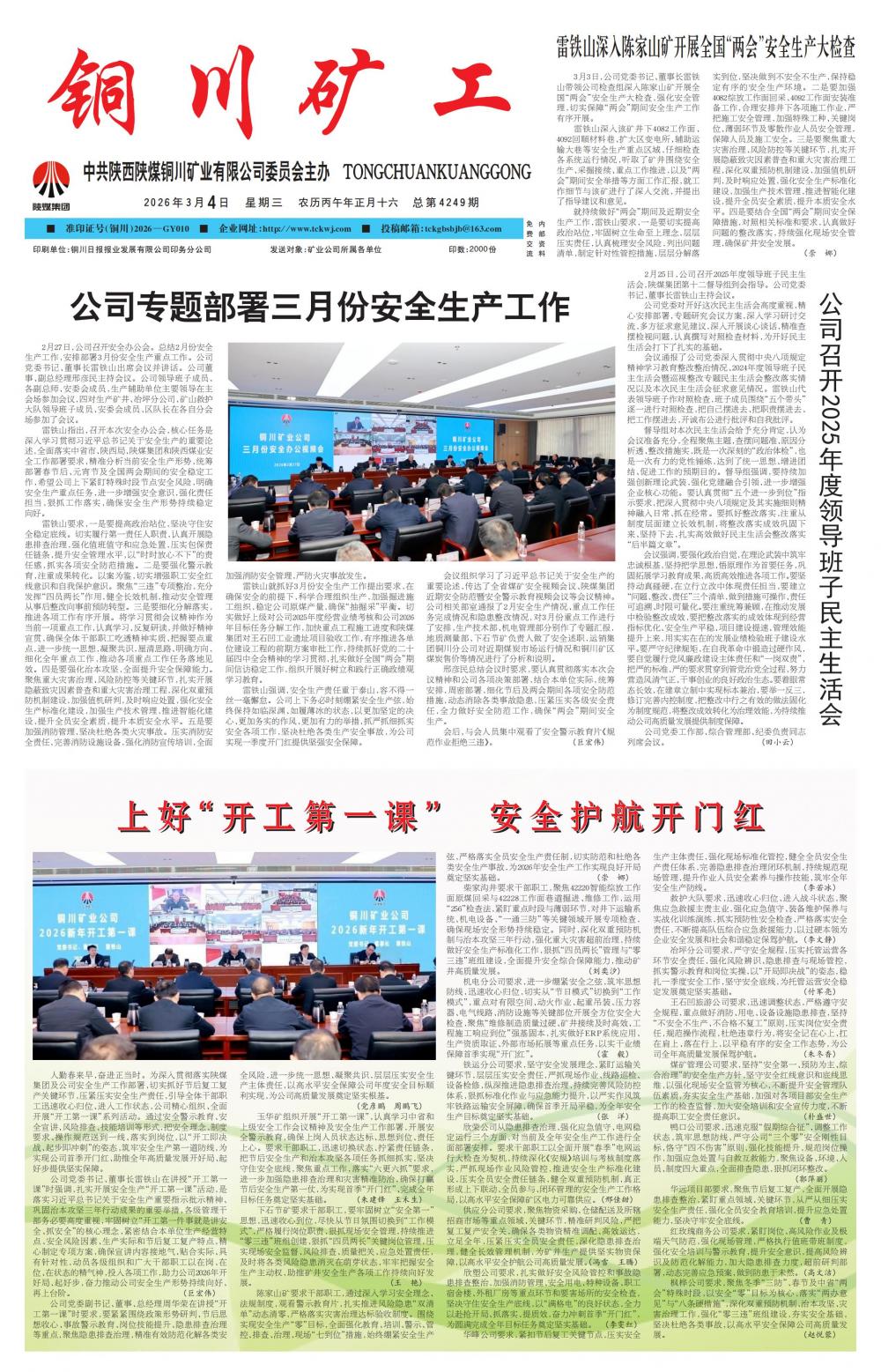 人勤春来早,奋进正当时。为深入贯彻落实陕煤集团及公司安全生产工作部署,切实抓好节后复工复产关键环节,压紧压实安全生产责任,引导全体干部职工迅速收心归位、进入工作状态,公司精心组织、全面开展“开工第一课”系列活动。通过安全警示教育、安全宣讲、风险排查、技能培训等形式,把安全理念、制度要求、操作规范送到一线、落实到岗位,以“开工即决战、起步即冲刺”的姿态,筑牢安全生产第一道防线,为实现公司首季开门红、助推全年高质量发展开好局、起好步提供坚实保障。 公司党委书记、董事长雷铁山在讲授“开工第一课”时强调,扎实开展安全生产“开工第一课”活动,是落实习近平总书记关于安全生产重要指示批示精神、巩固治本攻坚三年行动成果的重要举措,各级管理干部务必要高度重视,牢固树立“开工第一件事就是讲安全、抓安全”的核心理念,紧密结合本单位生产经营特点、安全风险因素、生产实际和节后复工复产特点,精心制定专项方案,确保宣讲内容接地气、贴合实际、具有针对性,动员各级组织和广大干部职工以在岗、在位、在状态的精气神,投入各项工作,助力公司2026年开好局、起好步,奋力推动公司安全生产形势持续向好、再上台阶。(巨宏伟) 公司党委副书记、董事、总经理周华荣在讲授“开工第一课”时要求,要紧紧围绕政策形势研判、节后思想收心、事故警示教育、岗位技能提升、隐患排查治理等重点,聚焦隐患排查治理,精准有效防范化解各类安全风险,进一步统一思想、凝聚共识,层层压实安全生产主体责任,以高水平安全保障公司年度安全目标顺利实现,为公司高质量发展奠定坚实根基。(党彦鹏 周鹏飞) 玉华矿组织开展“开工第一课”,认真学习中省和上级安全工作会议精神及安全生产工作部署,开展安全警示教育,确保上岗人员状态达标、思想到位、责任上心。要求干部职工,迅速切换状态、拧紧责任链条,把节后安全生产和治本攻坚各项任务抓细抓实,坚决守住安全底线,聚焦重点工作,落实“六更六抓”要求,进一步加强隐患排查治理和灾害精准防治,确保打赢节后安全生产第一仗,为实现首季“开门红”、完成全年目标任务奠定坚实基础。(朱建锋 王禾生) 下石节矿要求干部职工,要牢固树立“安全第一”思想,迅速收心到位,尽快从节日氛围切换到“工作模式”,严格履行岗位职责,狠抓现场安全管理,持续推进“零三违”班组创建,狠抓“四员两长”关键岗位管理,压实现场安全监督、风险排查、质量把关、应急处置责任,及时将各类风险隐患消灭在萌芽状态,牢牢把握安全生产主动权,助推矿井安全生产各项工作持续向好发展。(王 艳) 陈家山矿要求干部职工,通过深入学习安全理念、法规制度,观看警示教育片,扎实推进风险隐患“双清单”动态清零,严格落实灾害治理达标验收制度。围绕实现安全生产“零”目标,全面强化教育、培训、警示、管控、排查、治理、现场“七到位”措施,始终绷紧安全生产弦,严格落实全员安全生产责任制,切实防范和杜绝各类安全生产事故,为2026年安全生产工作实现良好开局奠定坚实基础。(崇 娜) 柴家沟井要求干部职工,聚焦42220智能综放工作面原煤回采与42228工作面巷道掘进、维修工作,运用“256”检查法,紧盯重点时段与薄弱环节,对井下运输系统、机电设备、“一通三防”等关键领域开展专项检查,确保现场安全形势持续稳定。同时,深化双重预防机制与治本攻坚三年行动,强化重大灾害超前治理,持续做好安全生产标准化工作,狠抓“四员两长”管理与“零三违”班组建设,全面提升安全综合保障能力,推动矿井高质量发展。(刘奕汐) 机电分公司要求,进一步绷紧安全之弦,筑牢思想防线,迅速收心归位,切实从“节日模式”切换到“工作模式”,重点对有限空间、动火作业、起重吊装、压力容器、电气线路、消防设施等关键部位开展全方位安全大检查,聚焦“维修制造质量过硬、矿井接续及时高效、工程施工响应到位”强基固本,扎实做好ERP系统应用、生产资质取证、外部市场拓展等重点任务,以实干业绩保障首季实现“开门红”。(霍 毅) 铁运分公司要求,坚守安全发展理念,紧盯运输关键环节,层层压实安全责任,严抓现场作业、线路巡检、设备检修,纵深推进隐患排查治理,持续完善风险防控体系,狠抓标准化作业与应急能力提升,以严实作风筑牢铁路运输安全屏障,确保首季开局平稳,为全年安全生产目标奠定坚实基础。(张 洋) 欣荣公司从隐患排查治理、强化应急值守、电网稳定运行三个方面,对当前及全年安全生产工作进行全面部署安排。要求干部职工以全面开展“春季”电网运行大检查为契机,持续深化《安规》培训与考核制度落实,严抓现场作业风险管控,推进安全生产标准化建设,压实全员安全责任链条,健全双重预防机制,真正形成上下联动、全员参与、闭环管理的安全生产工作格局,以高水平安全保障矿区电力可靠供应。(邢佳甜) 供应分公司要求,聚焦物资采购、仓储配送及所辖招商市场等重点领域、关键环节,精准研判风险,严把复工复产安全关,确保各类物资精准调配、高效运达,立足全年,压紧压实全员安全责任,深化隐患排查治理,健全长效管理机制,为矿井生产提供坚实物资保障,以高水平安全护航公司高质量发展。(冯雪 王腾) 欣塑公司要求,扎