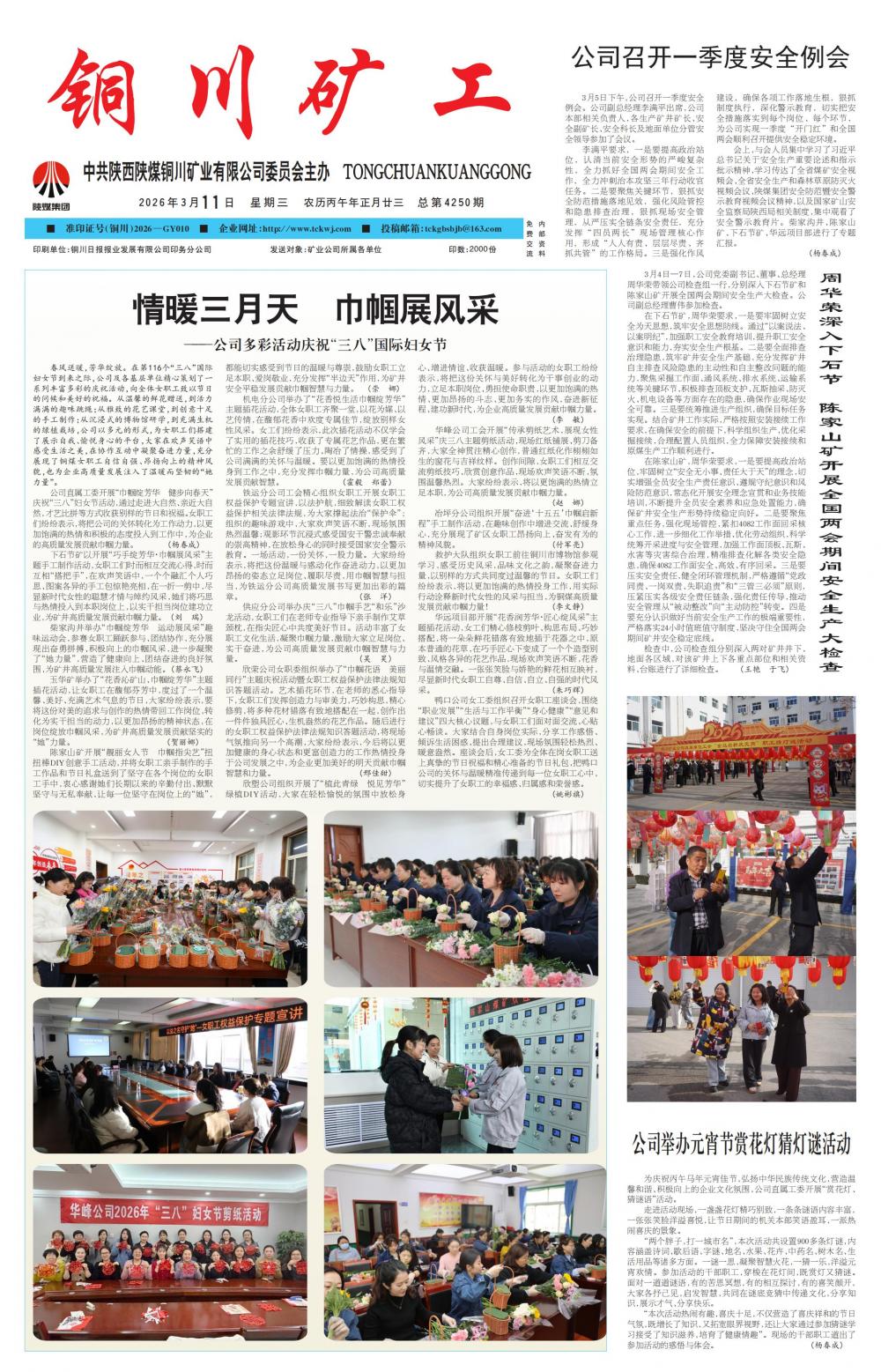春风送暖,芳华绽放。在第116个“三八”国际妇女节到来之际,公司及各基层单位精心策划了一系列丰富多彩的庆祝活动,向全体女职工致以节日的问候和美好的祝福。从温馨的鲜花赠送,到活力满满的趣味跳绳;从雅致的花艺课堂,到创意十足的手工制作;从沉浸式的博物馆研学,到充满生机的绿植栽培,公司以多元的形式,为女职工们搭建了展示自我、愉悦身心的平台,大家在欢声笑语中感受生活之美,在协作互动中凝聚奋进力量,充分展现了铜煤女职工自信自强、昂扬向上的精神风貌,也为企业高质量发展注入了温暖而坚韧的“她力量”。  公司直属工委开展“巾帼绽芳华 健步向春天”庆祝“三八”妇女节活动,通过走进大自然、亲近大自然,才艺比拼等方式收获别样的节日和祝福。女职工们纷纷表示,将把公司的关怀转化为工作动力,以更加饱满的热情和积极的态度投入到工作中,为企业的高质量发展贡献巾帼力量。(杨春成)  下石节矿以开展“巧手绽芳华·巾帼展风采”主题手工制作活动,女职工们时而相互交流心得,时而互相“搭把手”,在欢声笑语中,一个个融汇个人巧思、图案各异的手工包惊艳亮相,在一折一剪中,尽显新时代女性的聪慧才情与绰约风采,她们将巧思与热情投入到本职岗位上,以实干担当岗位建功立业,为矿井高质量发展贡献巾帼力量。(刘 瑞)  柴家沟井举办“巾帼绽芳华 运动展风采”趣味运动会,参赛女职工踊跃参与、团结协作,充分展现出奋勇拼搏、积极向上的巾帼风采,进一步凝聚了“她力量”,营造了健康向上、团结奋进的良好氛围,为矿井高质量发展注入巾帼动能。(蔡永飞)  玉华矿举办了“花香沁矿山、巾帼绽芳华”主题插花活动,让女职工在馥郁芬芳中,度过了一个温馨、美好、充满艺术气息的节日,大家纷纷表示,要将这份对美的追求与创作的热情带回工作岗位,转化为实干担当的动力,以更加昂扬的精神状态,在岗位绽放巾帼风采,为矿井高质量发展贡献坚实的“她”力量。(贺丽娜)  陈家山矿开展“靓丽女人节 巾帼指尖艺”扭扭棒DIY创意手工活动,并将女职工亲手制作的手工作品和节日礼盒送到了坚守在各个岗位的女职工手中,衷心感谢她们长期以来的辛勤付出、默默坚守与无私奉献,让每一位坚守在岗位上的“她”,都能切实感受到节日的温暖与尊崇,鼓励女职工立足本职、爱岗敬业,充分发挥“半边天”作用,为矿井安全平稳发展贡献巾帼智慧与力量。(崇 娜)  机电分公司举办了“花香悦生活巾帼绽芳华”主题插花活动,全体女职工齐聚一堂,以花为媒、以艺传情,在馥郁花香中欢度专属佳节,绽放别样女性风采。女工们纷纷表示,此次插花活动不仅学会了实用的插花技巧,收获了专属花艺作品,更在繁忙的工作之余舒缓了压力、陶冶了情操,感受到了公司满满的关怀与温暖。要以更加饱满的热情投身到工作之中,充分发挥巾帼力量,为公司高质量发展贡献智慧。(霍毅 郑蕾)  铁运分公司工会精心组织女职工开展女职工权益保护专题宣讲,以法护航,细致解读女职工权益保护相关法律法规,为大家撑起法治“保护伞”;组织的趣味游戏中,大家欢声笑语不断,现场氛围热烈温馨;观影环节沉浸式感受国安干警忠诚奉献的崇高精神,在放松身心的同时接受国家安全警示教育。一场活动,一份关怀,一股力量。大家纷纷表示,将把这份温暖与感动化作奋进动力,以更加昂扬的姿态立足岗位、履职尽责,用巾帼智慧与担当,为铁运分公司高质量发展书写更加出彩的篇章。(张 洋)  供应分公司举办庆“三八”巾帼手艺“和乐”沙龙活动,女职工们在老师专业指导下亲手制作艾草颈枕,在指尖匠心中共度美好节日。活动丰富了女职工文化生活,凝聚巾帼力量,激励大家立足岗位、实干奋进,为公司高质量发展贡献巾帼智慧与力量。(吴 昊)  欣荣公司女职委组织举办了“巾帼花语 美丽同行”主题庆祝活动暨女职工权益保护法律法规知识答题活动。艺术插花环节,在老师的悉心指导下,女职工们发挥创造力与审美力,巧妙构思,精心修剪,将多种花材错落有致地搭配在一起,创作出一件件独具匠心、生机盎然的花艺作品。随后进行的女职工权益保护法律法规知识答题活动,将现场气氛推向另一个高潮,大家纷纷表示,今后将以更加健康的身心状态和更富创造力的工作热情投身于公司发展之中,为企业更加美好的明天贡献巾帼智慧和力量。(邢佳甜)  欣塑公司组织开展了“植此青绿 悦见芳华”绿植DIY活动,大家在轻松愉悦的氛围中放松身心、增进情谊、收获温暖。参与活动的女职工纷纷表示,将把这份关怀与美好转化为干事创业的动力,立足本职岗位、勇担使命职责,以更加饱满的热情、更加昂扬的斗志、更加务实的作风,奋进新征程、建功新时代,为企业高质量发展贡献巾帼力量。(李 敏)  华峰公司工会开展“传承剪纸艺术,展现女性风采”庆三八主题剪纸活动,现场红纸铺展、剪刀备齐,大家全神贯注精心创作,普通红纸化作栩栩如生的窗花与吉祥纹样。创作间隙,女职工们相互交流剪纸技巧、欣赏创意作品,现场欢声笑语不断,氛围温馨热烈。大家纷纷表示,将以更饱满的热情立足本职,为公司高质量发展贡献巾帼力量。(赵 娜)  冶坪分公司组织开展“奋进‘十五五’巾帼启新程”手工制作活动,在趣味创作中增进交流、舒缓身心,充分展现了矿区女职工昂扬向