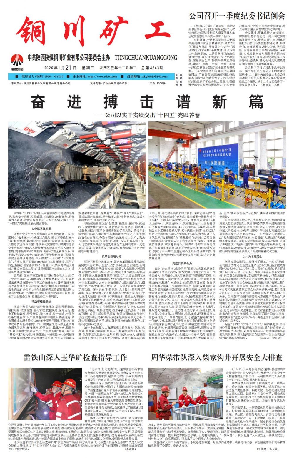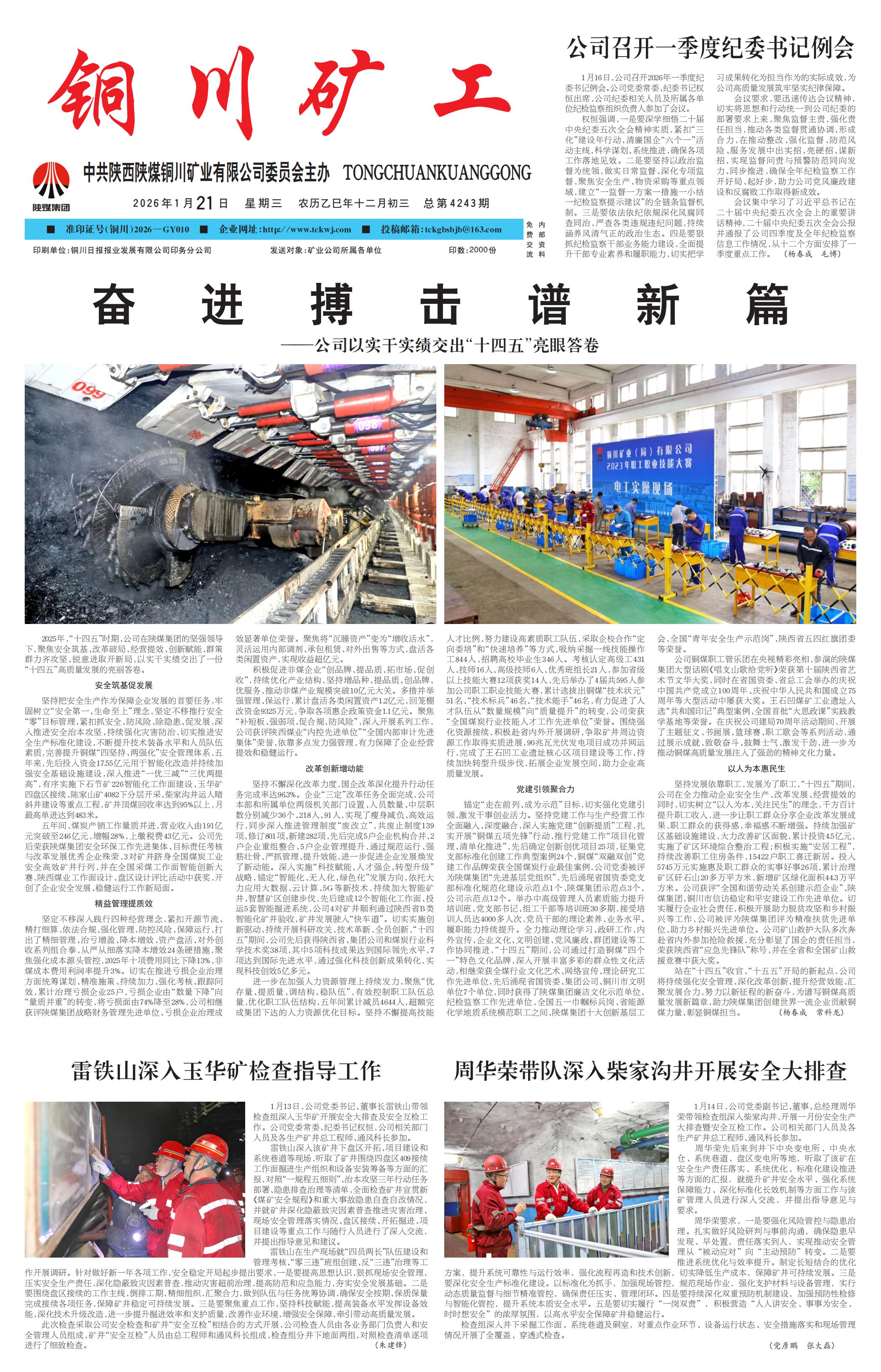 2025年,“十四五”时期,公司在陕煤集团的坚强领导下,聚焦安全筑基、改革破局、经营提效、创新赋能,群策群力齐攻坚、锐意进取开新局,以实干实绩交出了一份“十四五”高质量发展的亮丽答卷。安全筑基促发展 坚持把安全生产作为保障企业发展的首要任务,牢固树立“安全第一、生命至上”理念,坚定不移推行安全“零”目标管理,紧扣抓安全、防风险、除隐患、促发展,深入推进安全治本攻坚、持续强化灾害防治,切实推进安全生产标准化建设,不断提升技术装备水平和人员队伍素质,完善提升铜煤“四坚持、两强化”安全管理体系,五年来,先后投入资金17.55亿元用于智能化改造并持续加强安全基础设施建设,深入推进“一优三减”“三优两提高”,有序实施下石节矿226智能化工作面建设、玉华矿四盘区接续、陈家山矿4082下分层开采、柴家沟井运人暗斜井建设等重点工程,矿井顶煤回收率达到95%以上,月最高单进达到483米。五年间,煤炭产销工作量质并进,营业收入由191亿元突破至246亿元,增幅28%,上缴税费43亿元。公司先后荣获陕煤集团安全环保工作先进集体、目标责任考核与改革发展优秀企业殊荣,3对矿井跻身全国煤炭工业安全高效矿井行列,并在全国采煤工作面智能创新大赛,陕西煤业工作面设计、盘区设计评比活动中获奖,开创了企业安全发展、稳健运行工作新局面。精益管理提质效 坚定不移深入践行四种经营理念,紧扣开源节流、精打细算,依法合规、强化管理,防控风险、保障运行,打出了精细管理、治亏增盈、降本增效、资产盘活、对外创收系列组合拳,从严从细落实降本增效24条硬措施,聚焦强化成本源头管控,2025年十项费用同比下降13%,非煤成本费用利润率提升3%。切实在推进亏损企业治理方面统筹谋划、精准施策、持续加力、强化考核、跟踪问效,累计治理亏损企业25户,亏损企业由“数量下降”向“量质并重”的转变,将亏损面由74%降至28%,公司相继获评陕煤集团战略财务管理先进单位、亏损企业治理成效显著单位荣誉。聚焦将“沉睡资产”变为“增收活水”,灵活运用内部调剂、承包租赁、对外出售等方式,盘活各类闲置资产,实现收益超亿元。 积极促进非煤企业“创品牌、提品质、拓市场、促创收”,持续优化产业结构,坚持增品种、提品质、创品牌、优服务,推动非煤产业规模突破10亿元大关。多措并举强管理、保运行,累计盘活各类闲置资产1.2亿元,回笼棚改资金9325万元,争取各项惠企政策资金1.1亿元。聚焦“补短板、强弱项、促合规、防风险”,深入开展系列工作,公司获评陕西煤业“内控先进单位”“全国内部审计先进集体”荣誉,依靠多点发力强管理,有力保障了企业经营提效和稳健运行。改革创新增动能 坚持不懈深化改革力度,国企改革深化提升行动任务完成率达96.3%。企业“三定”改革任务全面完成,公司本部和所属单位两级机关部门设置、人员数量、中层职数分别减少36个、218人、91人,实现了瘦身减负、高效运行,同步深入推进管理制度“废改立”,共废止制度139项、修订801项、新建282项,先后完成5户企业机构合并、2户企业重组整合、5户企业管理提升,通过规范运行、强筋壮骨、严抓管理、提升效能,进一步促进企业发展焕发了新动能。深入实施“科技赋能、人才强企、转型升级”战略,锚定“智能化、无人化、绿色化”发展方向,依托大力应用大数据、云计算、5G等新技术,持续加大智能矿井、智慧矿区创建步伐,先后建成12个智能化工作面、投运5套智能掘进系统,公司4对矿井顺利通过陕西省B类智能化矿井验收,矿井发展驶入“快车道”。切实实施创新驱动,持续开展科研攻关、技术革新、全员创新,“十四五”期间,公司先后获得陕西省、集团公司和煤炭行业科学技术奖38项,其中5项科技成果达到国际领先水平,7项达到国际先进水平,通过强化科技创新成果转化,实现科技创效5亿多元。进一步在加强人力资源管理上持续发力,聚焦“优存量、提质量、调结构、稳队伍”,有效控制职工队伍总量,优化职工队伍结构,五年间累计减员4644人,超额完成集团下达的人力资源优化目标。坚持不懈提高技能人才比例,努力建设高素质职工队伍,采取企校合作“定向委培”和“快速培养”等方式,吸纳采掘一线技能操作工844人,招聘高校毕业生346人。考核认定高级工431人、技师16人、高级技师6人、优秀班组长21人,参加省级以上技能大赛12项获奖14人,先后举办了4届共595人参加公司职工职业技能大赛,累计选拔出铜煤“技术状元”51名、“技术标兵”46名、“技术能手”46名,有力促进了人才队伍从“数量规模”向“质量提升”的转变,公司荣获“全国煤炭行业技能人才工作先进单位”荣誉。围绕强化资源接续,积极赴省内外开展调研,争取矿井周边资源工作取得实质进展,90兆瓦光伏发电项目成功并网运行,完成了王石凹工业遗址核心区项目建设等工作,持续加快转型升级步伐,拓展企业发展空间,助力企业高质量发展。党建引领聚合力 锚定“走在前列、成为示范”目标,切实强化党建引领,激发干事创业活力。坚持党建工作与生产经营工作全面融入、深度融合,深入实施党建“创新提质”工程,扎实开展“铜煤五项先锋”行动,推行党建工作“项目化管理、清单化推进”,先后确定创新创优项目25项,征集党支部标准化创建工作典型案例24