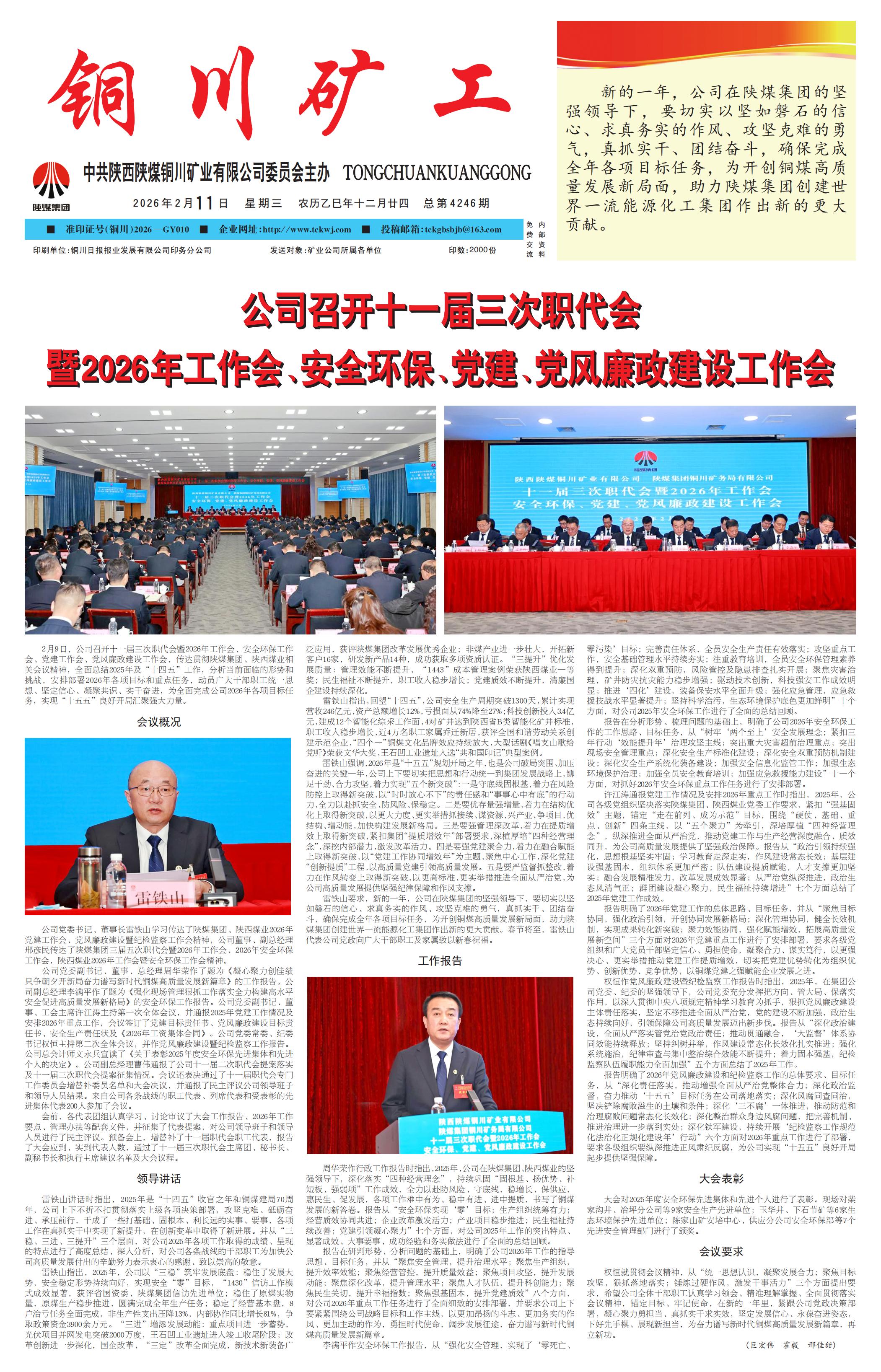 2月9日,公司召开十一届三次职代会暨2026年工作会、安全环保工作会、党建工作会、党风廉政建设工作会,传达贯彻陕煤集团、陕西煤业相关会议精神,全面总结2025年及“十四五”工作,分析当前面临的形势和挑战,安排部署2026年各项目标和重点任务,动员广大干部职工统一思想、坚定信心、凝聚共识、实干奋进,为全面完成公司2026年各项目标任务,实现“十五五”良好开局汇聚强大力量。会议概况  公司党委书记、董事长雷铁山学习传达了陕煤集团、陕西煤业2026年党建工作会、党风廉政建设暨纪检监察工作会精神,公司董事、副总经理邢彦民传达了陕煤集团三届五次职代会暨2026年工作会、2026年安全环保工作会,陕西煤业2026年工作会暨安全环保工作会精神。  公司党委副书记、董事、总经理周华荣作了题为《凝心聚力创佳绩 只争朝夕开新局奋力谱写新时代铜煤高质量发展新篇章》的工作报告。公司副总经理李满平作了题为《强化现场管理狠抓工作落实全力构建高水平安全促进高质量发展新格局》的安全环保工作报告。公司党委副书记、董事、工会主席许江涛主持第一次全体会议,并通报2025年党建工作情况及安排2026年重点工作,会议签订了党建目标责任书、党风廉政建设目标责任书、安全生产责任状及《2026年工资集体合同》。公司党委常委、纪委书记权恒主持第二次全体会议,并作党风廉政建设暨纪检监察工作报告。公司总会计师文永兵宣读了《关于表彰2025年度安全环保先进集体和先进个人的决定》。公司副总经理曹伟通报了公司十一届二次职代会提案落实及十一届三次职代会提案征集情况。会议还表决通过了十一届职代会专门工作委员会增替补委员名单和大会决议,并通报了民主评议公司领导班子和领导人员结果。来自公司各条战线的职工代表、列席代表和受表彰的先进集体代表200人参加了会议。  会前,各代表团组认真学习、讨论审议了大会工作报告、2026年工作要点、管理办法等配套文件,并征集了代表提案,对公司领导班子和领导人员进行了民主评议。预备会上,增替补了十一届职代会职工代表,报告了大会应到、实到代表人数,通过了十一届三次职代会主席团、秘书长、副秘书长和执行主席建议名单及大会议程。领导讲话  雷铁山讲话时指出,2025年是“十四五”收官之年和铜煤建局70周年,公司上下不折不扣贯彻落实上级各项决策部署,攻坚克难、砥砺奋进、承压前行,干成了一些打基础、固根本、利长远的实事、要事,各项工作在真抓实干中实现了新提升,在创新变革中取得了新进展。并从“三稳、三进、三提升”三个层面,对公司2025年各项工作取得的成绩、呈现的特点进行了高度总结、深入分析,对公司各条战线的干部职工为加快公司高质量发展付出的辛勤努力表示衷心的感谢、致以崇高的敬意。  雷铁山指出,2025年,公司以“三稳”筑牢发展底盘:稳住了发展大势,安全稳定形势持续向好,实现安全“零”目标,“1430”信访工作模式成效显著,获评省国资委、陕煤集团信访先进单位;稳住了原煤实物量,原煤生产稳步推进,圆满完成全年生产任务;稳定了经营基本盘,8户治亏任务全面完成,非生产性支出压降13%,内部协作同比增长81%,争取政策资金3900余万元。“三进”增添发展动能:重点项目进一步蓄势,光伏项目并网发电突破2000万度,王石凹工业遗址进入竣工收尾阶段;改革创新进一步深化,国企改革、“三定”改革全面完成,新技术新装备广泛应用,获评陕煤集团改革发展优秀企业;非煤产业进一步壮大,开拓新客户16家,研发新产品14种,成功获取多项资质认证。“三提升”优化发展质量:管理效能不断提升,“1443”成本管理案例荣获陕西煤业一等奖;民生福祉不断提升,职工收入稳步增长;党建质效不断提升,清廉国企建设持续深化。  雷铁山指出,回望“十四五”,公司安全生产周期突破1300天,累计实现营收246亿元,资产总额增长12%,亏损面从74%降至27%;科技创新投入3.4亿元,建成12个智能化综采工作面,4对矿井达到陕西省B类智能化矿井标准,职工收入稳步增长,近4万名职工家属乔迁新居,获评全国和谐劳动关系创建示范企业,“四个一”铜煤文化品牌效应持续放大,大型话剧《唱支山歌给党听》荣获文华大奖,王石凹工业遗址入选“共和国印记”典型案例。  雷铁山强调,2026年是“十五五”规划开局之年,也是公司破局突围、加压奋进的关键一年,公司上下要切实把思想和行动统一到集团发展战略上,铆足干劲、合力攻坚,着力实现“五个新突破”:一是守底线固根基,着力在风险防控上取得新突破,以“时时放心不下”的责任感和“事事心中有底”的行动力,全力以赴抓安全、防风险、保稳定。二是要优存量强增量,着力在结构优化上取得新突破,以更大力度、更实举措抓接续、谋资源,兴产业、争项目,优结构、增动能,加快构建发展新格局。三是要强管理深改革,着力在提质增效上取得新突破,紧扣集团“提质增效年”部署要求,深植厚培“四种经营理念”,深挖内部潜力,激发改革活力。四是要强党建聚合力,着力在融合赋能上取得新突破,以“党建工作协同增效年”为主题,聚焦中心工作,深化党建“创新提质”工程,以高质量党建引领高质量发展。五是要严监督抓整改,着力在作风转变上取得新突破,以更高标准、更实举措推进全面从严治党,为公