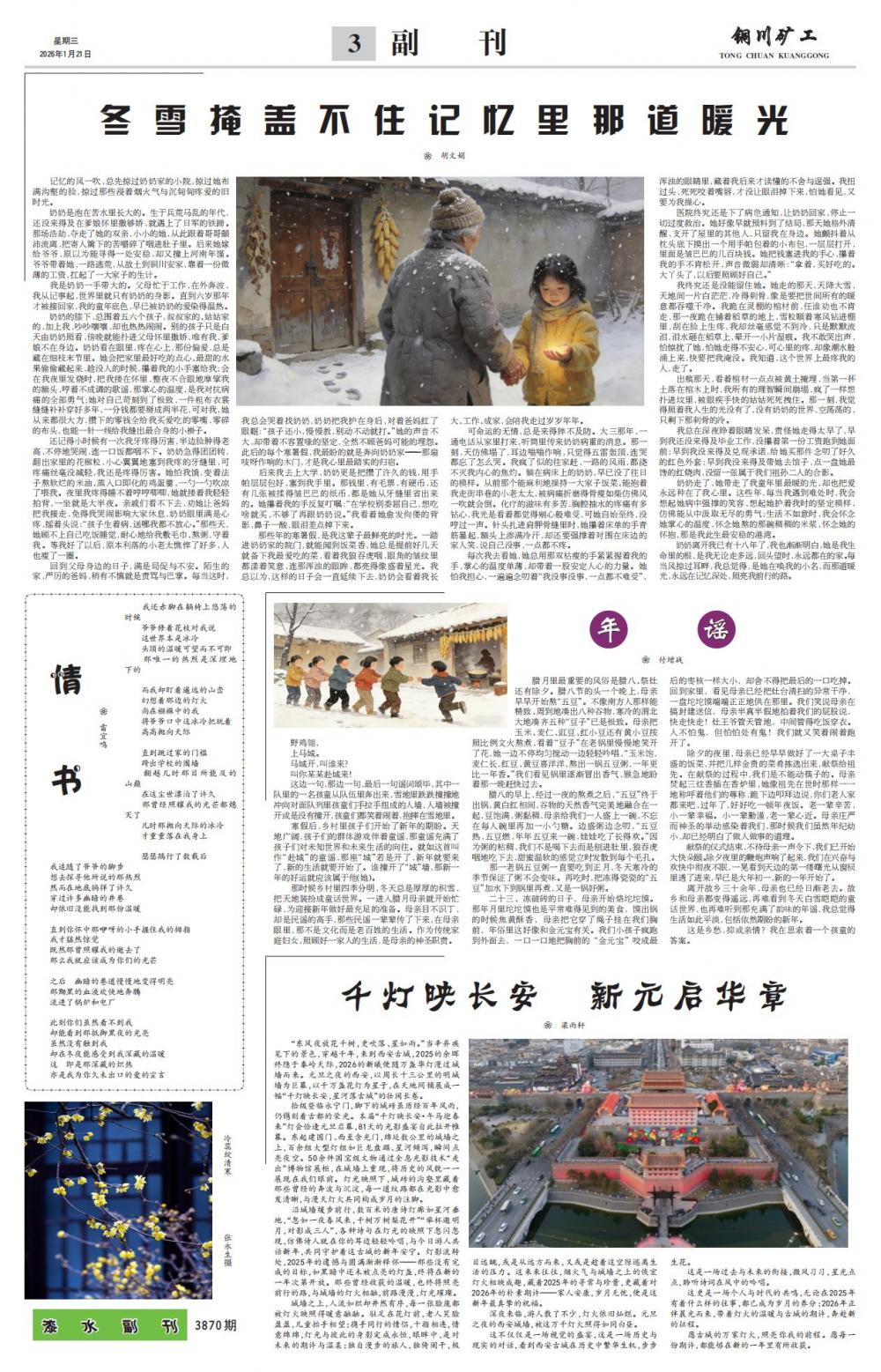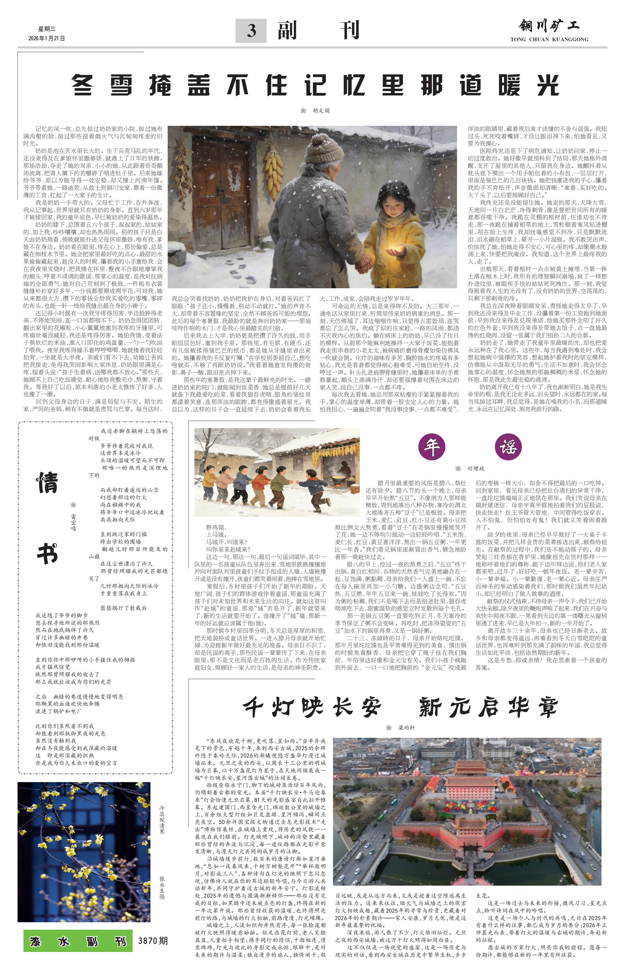 野鸡翎, 上马城。 马城开,叫谁来? 叫你某某赴城来! 这边一句,那边一句,最后一句谣词颂毕,其中一队里的一名孩童从队伍里奔出来,雪地里跌跌撞撞地冲向对面队列里孩童们手拉手组成的人墙,人墙被撞开或是没有撞开,孩童们都笑着闹着,抱摔在雪地里。 寒假后,乡村里孩子们开始了新年的期盼。天地广阔,孩子们的群体游戏伴着童谣,那童谣充满了孩子们对未知世界和未来生活的向往。就如这首叫作“赴城”的童谣,那座“城”若是开了,新年就要来了,新的生活就要开始了。谁撞开了“城”墙,那新一年的好运就应该属于他(她)。 那时候乡村里四季分明,冬天总是厚厚的积雪,把天地装扮成童话世界。一进入腊月母亲就开始忙碌,为迎接新年做好最充足的准备。母亲目不识丁,却是民谣的高手,那些民谣一辈辈传了下来,在母亲眼里,那不是文化而是老百姓的生活。作为传统家庭妇女,照顾好一家人的生活,是母亲的神圣职责。 腊月里最重要的风俗是腊八、祭灶还有除夕。腊八节的头一个晚上,母亲早早开始熬“五豆”。不像南方人那样能精致、周到地凑出八种谷物,寒冷的渭北大地凑齐五种“豆子”已是极致。母亲把玉米、麦仁、豇豆、红小豆还有黄小豆按照比例文火熬煮,看着“豆子”在老锅里慢慢地笑开了花,她一边不停均匀搅动一边轻轻吟唱,“玉米饱,麦仁长,红豆、黄豆喜洋洋,熬出一锅五豆粥,一年更比一年香。”我们看见锅里逐渐冒出香气,猴急地盼着那一晚赶快过去。 腊八的早上,经过一夜的熬煮之后,“五豆”终于出锅,黄白红相间,谷物的天然香气完美地融合在一起,豆饱满,粥黏稠,母亲给我们一人盛上一碗,不忘在每人碗里再加一小勺糖。边盛粥边念叨,“五豆热,五豆燃,年年五豆来一碗,娃娃吃了长得欢。”因为粥的粘稠,我们不是喝下去而是刨进肚里,狼吞虎咽地吃下去,甜蜜温软的感觉立时发散到每个毛孔。 那一老锅五豆粥一直要吃到正月,冬天寒冷的季节保证了粥不会变味。再吃时,把冻得瓷瓷的“五豆”加水下到锅里再煮,又是一锅好粥。 二十三、冻破砖的日子,母亲开始烙坨坨馍。那年月里坨坨馍也是平常难得见到的美食,馍出锅的时候焦黄酥香,母亲把它穿了绳子挂在我们胸前,年俗里这好像和金元宝有关。我们小孩子疯跑到外面去,一口一口地把胸前的“金元宝”咬成最后的枣核一样大小,却舍不得把最后的一口吃掉。回到家里,看见母亲已经把灶台清扫的异常干净,一盘坨坨馍端端正正地供在那里。我们笑说母亲在搞封建迷信,母亲半真半假地拍着我们的屁股说,快走快走!灶王爷管天管地,中间管得吃饭穿衣。人不怕鬼,但怕怕处有鬼!我们就又笑着闹着跑开了。 除夕的夜里,母亲已经早早做好了一大桌子丰盛的饭菜,并把几样金贵的菜肴拣选出来,献祭给祖先。在献祭的过程中,我们是不能动筷子的。母亲焚起三炷香插在香炉里,她像祖先在世时那样一一地称呼着他们的尊称,跪下边叩拜边说,你们老人家都来吧,过年了,好好吃一顿年夜饭。老一辈辛苦,小一辈幸福。小一辈勤谨,老一辈心近。母亲庄严而神圣的举动感染着我们,那时候我们虽然年纪幼小,却已经明白了做人做事的道理。 献祭的仪式结束,不待母亲一声令下,我们已开始大快朵颐。除夕夜里的鞭炮声响了起来,我们在兴奋与欢快中彻夜不眠,一晃看到天边的第一缕曙光从窗棂里透了进来,早已是大年初一,新的一年开始了。 离开故乡三十余年,母亲也已经日渐老去。故乡和母亲都变得遥远,再难看到冬天白雪皑皑的童话世界,也再难听到那充满了韵味的年谣,我总觉得生活如此平淡,包括依然期盼的新年。 这是乡愁,抑或亲情?我在思索着一个孩童的答案。
