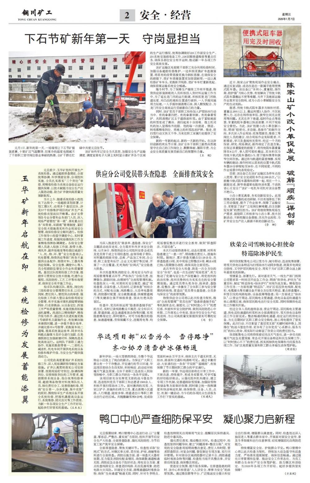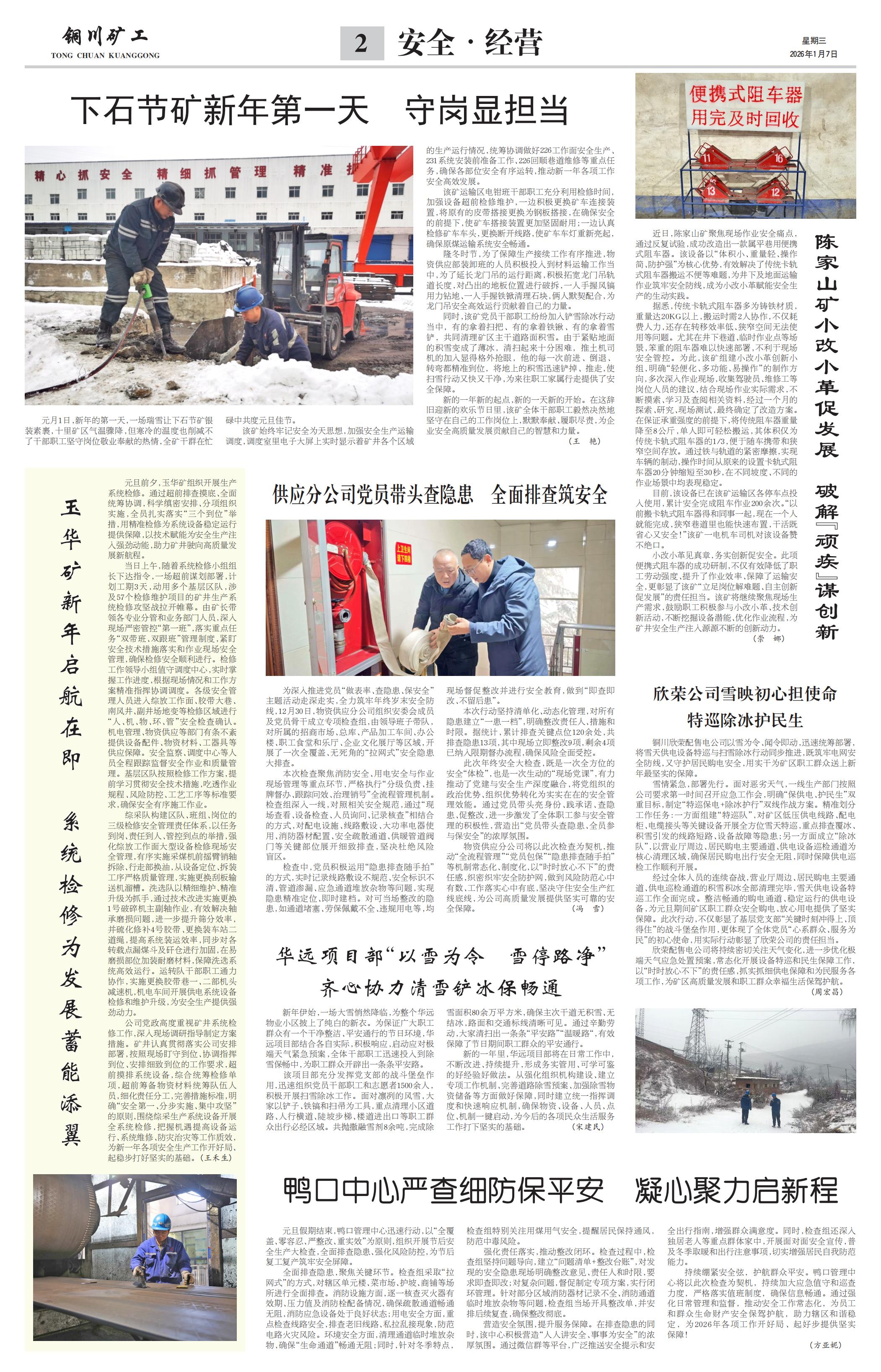 元月1日,新年的第一天,一场瑞雪让下石节矿银装素裹,十里矿区气温骤降,但寒冷的温度也削减不了干部职工坚守岗位敬业奉献的热情,全矿干群在忙碌中共度元旦佳节。该矿始终牢记安全为天思想,加强安全生产运输调度,调度室里电子大屏上实时显示着矿井各个区域的生产运行情况,统筹协调做好226工作面安全生产、231系统安装前准备工作、226回顺巷道维修等重点任务,确保各部位安全有序运转,推动新一年各项工作安全高效发展。该矿运输区电钳班干部职工充分利用检修时间,加强设备超前检修维护,一边积极更换矿车连接装置,将原有的皮带搭接更换为钢板搭接,在确保安全的前提下,使矿车搭接装置更加坚固耐用;一边认真检修矿车车头,更换断开线路,使矿车车灯重新亮起,确保原煤运输系统安全畅通。隆冬时节,为了保障生产接续工作有序推进,物资供应部装卸班的人员积极投入到材料运输工作当中,为了延长龙门吊的运行距离,积极拓宽龙门吊轨道长度,对凸出的地板位置进行破拆,一人手握风镐用力钻地、一人手握铁锨清理石块,俩人默契配合,为龙门吊安全高效运行贡献着自己的力量。同时,该矿党员干部职工纷纷加入铲雪除冰行动当中,有的拿着扫把、有的拿着铁锹、有的拿着雪铲,共同清理矿区主干道路面积雪。由于紧贴地面的积雪变成了薄冰,清扫起来十分困难,推土机司机的加入显得格外抢眼,他的每一次前进、倒退、转弯都精准到位,将地上的积雪迅速铲掉、推走,使扫雪行动又快又干净,为来往职工家属行走提供了安全保障。新的一年新的起点,新的一天新的开始。在这辞旧迎新的欢乐节日里,该矿全体干部职工毅然决然地坚守在自己的工作岗位上,默默奉献、履职尽责,为企业安全高质量发展贡献自己的智慧和力量。