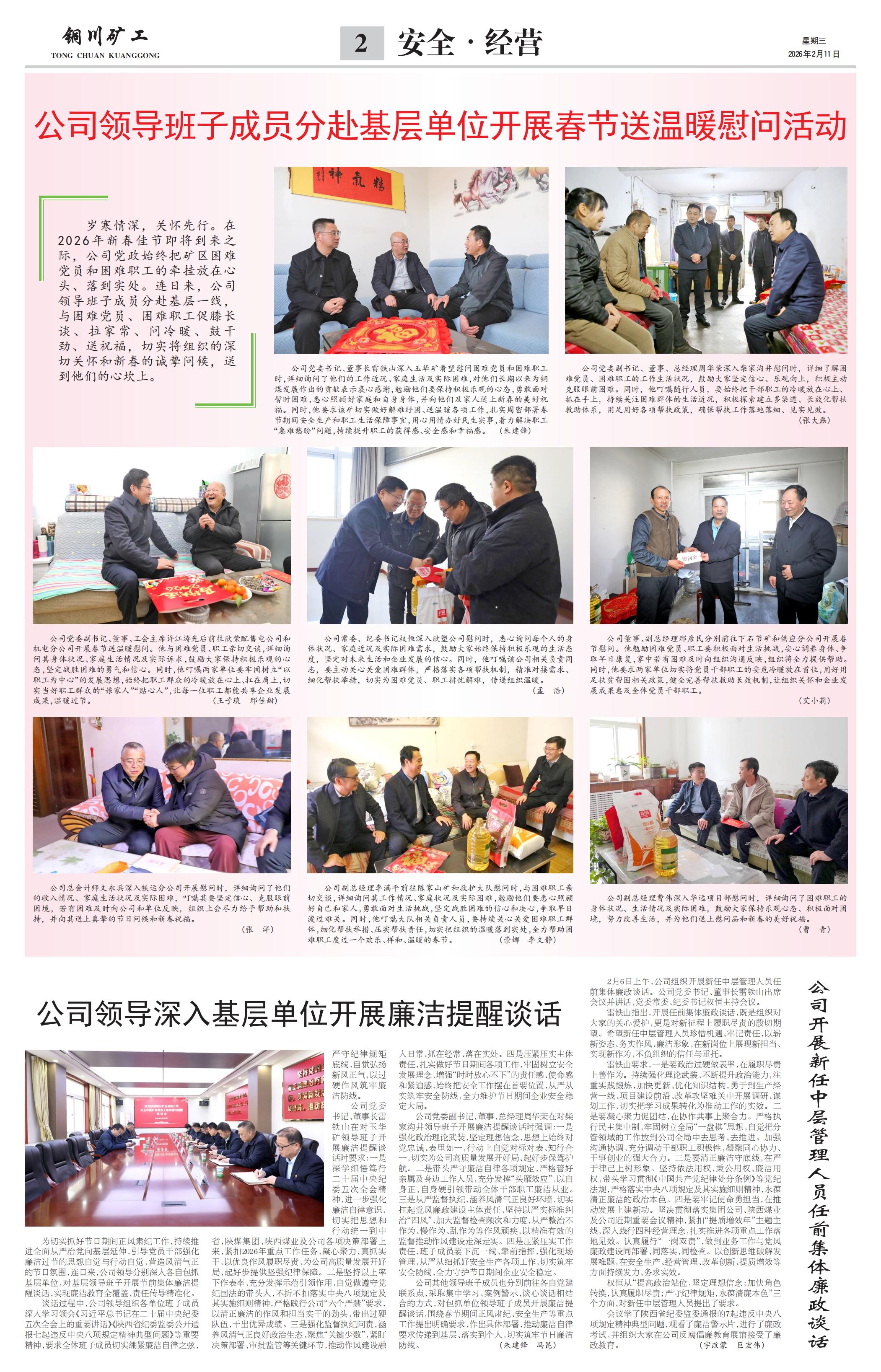 岁寒情深,关怀先行。在2026年新春佳节即将到来之际,公司党政始终把矿区困难党员和困难职工的牵挂放在心头、落到实处。连日来,公司领导班子成员分赴基层一线,与困难党员、困难职工促膝长谈、拉家常、问冷暖、鼓干劲、送祝福,切实将组织的深切关怀和新春的诚挚问候,送到他们的心坎上。公司党委书记、董事长雷铁山深入玉华矿看望慰问困难党员和困难职工时,详细询问了他们的工作近况、家庭生活及实际困难,对他们长期以来为铜煤发展作出的贡献表示衷心感谢,勉励他们要保持积极乐观的心态,勇敢面对暂时困难,悉心照顾好家庭和自身身体,并向他们及家人送上新春的美好祝福。同时,他要求该矿切实做好解难纾困、送温暖各项工作,扎实周密部署春节期间安全生产和职工生活保障事宜,用心用情办好民生实事,着力解决职工“急难愁盼”问题,持续提升职工的获得感、安全感和幸福感。 (朱建锋)公司党委副书记、董事、总经理周华荣深入柴家沟井慰问时,详细了解困难党员、困难职工的工作生活状况,鼓励大家坚定信心、乐观向上,积极主动克服眼前困难。同时,他叮嘱随行人员,要始终把干部职工的冷暖放在心上、抓在手上,持续关注困难群体的生活近况,积极探索建立多渠道、长效化帮扶救助体系,用足用好各项帮扶政策,确保帮扶工作落地落细、见实见效。(张大磊)公司党委副书记、董事、工会主席许江涛先后前往欣荣配售电公司和机电分公司开展春节送温暖慰问。他与困难党员、职工亲切交谈,详细询问其身体状况、家庭生活情况及实际诉求,鼓励大家保持积极乐观的心态,坚定战胜困难的勇气和信心。同时,他叮嘱两家单位要牢固树立“以职工为中心”的发展思想,始终把职工群众的冷暖放在心上、扛在肩上,切实当好职工群众的“娘家人”“贴心人”,让每一位职工都能共享企业发展成果,温暖过节。(王子琰 邢佳甜)公司常委、纪委书记权恒深入欣塑公司慰问时,悉心询问每个人的身体状况、家庭近况及实际困难需求,鼓励大家始终保持积极乐观的生活态度,坚定对未来生活和企业发展的信心。同时,他叮嘱该公司相关负责同志,要主动关心关爱困难群体,严格落实各项帮扶机制,精准对接需求、细化帮扶举措,切实为困难党员、职工排忧解难,传递组织温暖。(孟 浩)公司董事、副总经理邢彦民分别前往下石节矿和供应分公司开展春节慰问。他勉励困难党员、职工要积极面对生活挑战,安心调养身体、争取早日康复,家中若有困难及时向组织沟通反映,组织将全力提供帮助。同时,他要求两家单位切实将党员干部职工的安危冷暖放在首位,用好用足扶贫帮困相关政策,健全完善帮扶救助长效机制,让组织关怀和企业发展成果惠及全体党员干部职工。(艾小莉)公司总会计师文永兵深入铁运分公司开展慰问时,详细询问了他们的收入情况、家庭生活状况及实际困难,叮嘱其要坚定信心、克服眼前困境,若有困难及时向公司和单位反映,组织上会尽力给予帮助和扶持,并向其送上真挚的节日问候和新春祝福。(张 洋)公司副总经理李满平前往陈家山矿和救护大队慰问时,与困难职工亲切交谈,详细询问其工作情况、家庭状况及实际困难,勉励他们要悉心照顾好自己和家人,勇敢面对生活挑战,坚定战胜困难的信心和决心,争取早日渡过难关。同时,他叮嘱大队相关负责人员,要持续关心关爱困难职工群体,细化帮扶举措、压实帮扶责任,切实把组织的温暖落到实处,全力帮助困难职工度过一个欢乐、祥和、温暖的春节。(崇娜 李文静)公司副总经理曹伟深入华远项目部慰问时,详细询问了困难职工的身体状况、生活情况及实际困难,鼓励大家保持乐观心态、积极面对困境,努力改善生活,并为他们送上慰问品和新春的美好祝福。(曹 青)