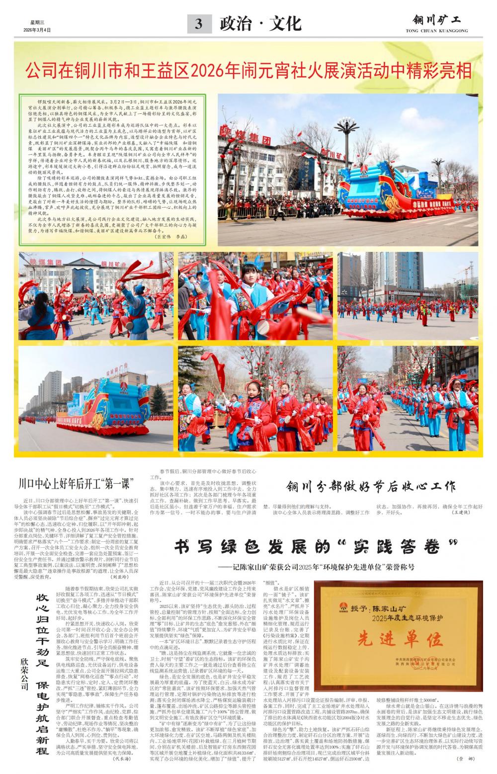 近日,从公司召开的十一届三次职代会暨2026年工作会、安全环保、党建、党风廉政建设工作会上传来喜讯,陈家山矿荣获公司“环境保护先进单位”荣誉称号。 2025以来,该矿坚持“生态优先、源头防治、过程管控、总量控制”的管理方针,按照“全面达标、全力创标、全部利用”的环保工作思路,不断深化环保安全管理“零”目标,让矿井的生态“底色”愈发葱郁,外在“颜值”持续攀升,环境“气质”更加宜人,为矿井安全平稳发展提供坚实“绿色”保障。 一本“矿区环境日志”,默默记录着生态守护历程中的点滴足迹。 “瞧,这是扬尘在线监测系统,它就像一位忠诚的卫士,时刻‘守望’着矿区的生态指标。该矿的环保负责人每天的主要工作之一就是通过后台查看扬尘在线监测系统运营值,记录着矿区环境的每一天。 绿色,是安全发展的底色,也是矿井安全平稳发展最为厚重的底蕴。为了使蓝天、白云、绿水成为矿区的“常驻嘉宾”,该矿按照环保要求,加强天然气管理运行管理,定期对锅炉污染物达标排放等进行检测;落实全封闭煤场洒水降尘,严格煤炭运输装载计量、篷布覆盖、出场冲洗、矿区公路抑尘等源头管控措施,严抓外包单位建筑施工“六个100%”扬尘管理,做到文明安全施工,有效改善矿区空气环境质量。 “矿中有绿”逐渐变为“绿中有矿”,为了让这份绿更加浓郁,愈发精致。该矿不断厚植“绿色家底”,加大环境绿化力度,在矿区空地、马路两侧及机关楼院内、工业场地草坪(花园)补栽植绿,在三月植树节期间,分别在矿机关楼前、后及智能矿灯房东西侧花园等区域开展空地覆土补植绿化,绿化面积共8133.6㎡,实现了办公环境的绿化美化,增加了“绿值”,提升了“颜值”。 碧水是矿区颜值的一面“镜子”。该矿扎实做足“水文章”,擦亮“水名片”,严抓井下污水处理厂环保设备设施维护及岗位人员精细化管理,规范运行记录及台账,完善了《污染设施档案》,定期进行水质比对,保证在线运行数据稳定上传,处理水质达标排放;实施了陈家山矿安子沟矿井水处理厂调蓄池建设及配套设备安装工作,规范了工艺流程;认真落实省市关于入河排污口监督管理工作要求,开展了矿井水处理站入河排污口设置论证报告编制、评审、申报、备案工作,同时,完成了主工业场地矿井水处理站入河排污口设置管路改造工程,共铺设管路2070m,确保了排出的水体满足《陕西省水功能区划(2004版)》对水功能区的保护目标。 绿色为“擎”,助力土地恢复。该矿严抓石矸山综合治理整治力度,制定矸石山分区治理方案,开展“边排放,边治理”,落实黄土覆盖和场地防扬散措施,煤矸石安全无害化填埋处置率达到100%;实施了矸石山排矸场南侧综合治理项目,现已完成治理区域平台斜坡刷坡5127㎡、矸石开挖14527㎡、倒运矸石2100㎡、边坡修整铺设秸秆纤维土5000㎡。 绿水青山就是金山银山。在这诗情与浪漫的隽永画卷的背后,是该矿加强生态文明建设、践行绿色发展理念的自觉行动,是坚定不移走生态优先、绿色发展之路的全新实践。 新征程上,陈家山矿将继续秉持绿色发展理念,逐绿而生,向绿而行,不断加大绿色矿山建设力度,进一步完善矿区生态环境治理体系,以实际行动续写资源开发与环境保护协调发展的时代答卷,为铜煤高质量发展注入新动能。