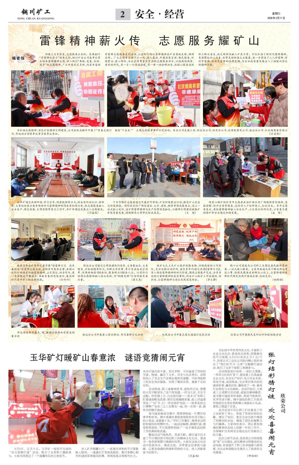 阳春三月芳菲至,志愿服务正当时。在第63个“学雷锋纪念日”到来之际,铜川矿业公司各单位紧扣传承雷锋精神主题,深入践行“奉献、友爱、互助、进步”的志愿精神,广泛开展形式多样、内容丰富的学雷锋志愿服务系列活动,以实际行动让雷锋精神在矿区落地生根、熠熠生辉。广大志愿者主动下沉一线、深入基层,开展政策宣讲、便民服务、环境整治、爱心帮扶、安全宣传等务实管用的志愿服务项目,以饱满的热情、务实的作风,用一言一行传递温暖,用一举一动诠释担当,把贴心服务送到职工群众身边,把文明新风融入矿区日常。不仅弘扬了新时代雷锋精神,更凝聚起向上向善、互帮互助的强大正能量,进一步营造了人人学雷锋、时时学雷锋、处处见雷锋的浓厚氛围,为企业高质量发展注入了温暖而坚定的精神力量。为弘扬志愿精神,深化矿区精神文明建设,公司在机关楼外开展了“青春志愿行 奋进‘十五五’” 主题志愿服务集中示范活动。来自公司直属工委、供应分公司、机电分公司、欣荣配售电公司、铁运分公司、红玫瑰商务管理公司、华远项目部等单位等多家单位参加。(巨宏伟)玉华矿通过共同研读、学习分享、观看视频等方式,结合实际谈认识、讲体会,大家纷纷表示要争做新时代雷锋精神的传承者和践行者,把志愿服务融入安全生产、绿色发展、文明实践等重点工作中,为矿井建设发展注入志愿暖流。(闫嘉瑞)下石节煤矿志愿者通过开展护河净滩、矿区环境整治行动,擦亮矿山生态与环境颜值。同时在欣怡广场设普法、义诊、理发、维修等便民服务点,送上一站式贴心关怀,该矿将雷锋精神与生产经营深度融合,以精神文明建设赋能矿井高质量发展,持续擦亮文明单位标兵底色。(王 艳)陈家山煤矿组织青年志愿者在该矿俱乐部广场提供家电维修、急救讲解、防诈宣传等服务,还结对入户陪伴老人、打扫卫生。青年志愿者表示,要把雷锋精神融入安全生产,立足岗位钻研攻坚,以青春力量助推矿井安全稳定和谐发展。(益 哲)柴家沟井在矿青年之家开展“读雷锋日记 谈青春担当”学雷锋主题活动,全体青年集体宣誓,承诺以实际行动传承弘扬雷锋精神,立足岗位、担当作为,进一步凝聚起干事创业、奉献青春的思想共识,展现新时代青年职工的良好风貌。(白雨竹)供应分公司通过文明创建快问快答、义务量血压、义务理发、手机贴膜等形式,为群众办实事,累计发放各类宣传单、环保购物袋100余份,服务群众100余人次。以实际行动将志愿精神融入岗位实践,为“铜煤先锋”行动贡献青春力量。(梁文惠)救护大队立足矿山救护执勤备勤、训练救援的工作实际,灵活安排活动时间,团员青年们通过共读《雷锋日记》,深入领会雷锋精神的时代价值,围绕主题展开交流,分享身边践行雷锋精神的真实事例,结合矿山救护工作谈感悟、话担当,让雷锋精神与岗位实践深度结合。(李文静)鸭口公司团委为公司职工及周边居民提供零距离、一站式暖心服务。大家用真诚与实干解决群众身边小事,把便民服务送到群众心坎上,让雷锋精神在新时代便民实践中落地生根、绽放光彩。(姚彬旗)华远项目部开展头、颈、腰理疗按摩和骨密度测量活动铁运分公司开展爱心茶水驿站、书写雷锋日记活动机电分公司开展志愿交通指引送花活动欣荣公司开展便民复印打印和配钥匙活动