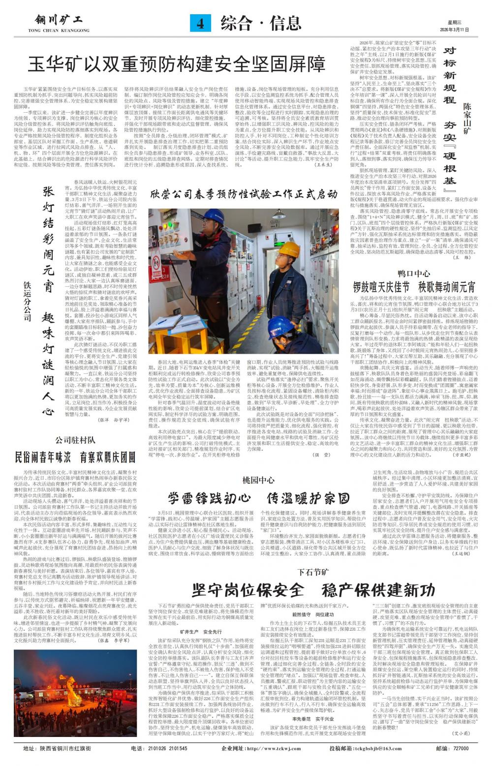 玉华矿紧紧围绕安全生产目标任务,以落实双重预防机制为抓手,突出问题导向,抓实风险超前防控,完善建强安全管理体系,为安全稳定发展构建坚固屏障。 一季度以来,该矿进一步健全完善以年度辨识为统领、专项辨识为支撑、岗位辨识为核心的安全风险分级管控体系,将风险辨识评估触角向班组、岗位延伸,助力实现风险防控落细落实到现场。各专业严格按照风险分级管控程序,制度化组织业务部室、基层区队对采掘工作面、生产系统、巷道硐室等作业区域,进行拉网式风险点排查,从“人、机、物、环”四个层面开展全方位危险源辨识。在此基础上,结合辨识出的危险源进行科学风险评价和定级,按照风险等级分类管理,责任落实到岗。坚持将风险辨识评估结果融入安全生产岗位责任制,编订制作岗位风险管控应知应会卡,明确各岗位的风险点、风险等级及管控措施。建立“年度辨识+专项辨识+岗位辨识”的动态更新机制,针对厚煤层放顶煤、接续工作面长距离供电通风等关键环节,及时开展专项风险辨识评估,细化管控措施,并强化干部现场跟带班和走动式监督管理,确保风险管控措施执行到位。 按照“全员排查、分级治理、闭环管理”模式,矿井扎实开展隐患排查治理工作,切实把第二重预防落到实处。 制订落实月度隐患排查计划,动员组织全员参与隐患排查,形成矿领导、业务科室、区队、班组和岗位的五级隐患排查网络。定期对排查情况进行统计分析,追溯隐患形成原因,深入查找系统、措施、设备、岗位等现场管理的短板。充分利用信息化手段,以安全监测监控系统为抓手,配合管理人员使用移动智能终端,实现现场风险管控和隐患排查信息化管理体系。通过安全信息平台,对隐患排查、整改、验收等全过程进行实时跟踪,实现隐患治理的可追溯、可考核。坚持将全员安全素质教育培训贯穿始终,以增强职工识风险、辨风险、控风险的能力为重点,全方位提升职工安全技能。从风险辨识和防控入手,针对不同岗位、工种制定个性化培训方案,结合岗位实际,深入辨识生产环节、作业地点安全风险,不断完善安全风险数据库。通过开展应急演练、手绘避灾路线、盲戴自救器、“事故大反思、大讨论”等活动,提升职工应急能力,筑牢安全生产防线。