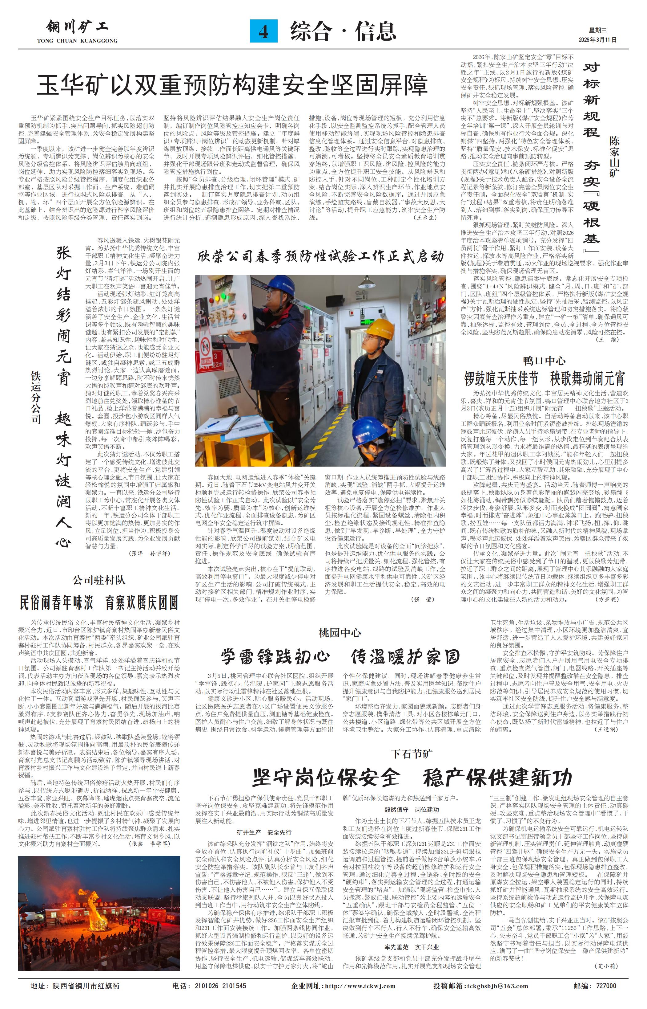 2026年,陈家山矿坚定安全“零”目标不动摇,紧扣安全生产治本攻坚三年行动“决胜之年”主线,以2月1日施行的新版《煤矿安全规程》为标尺,持续树牢安全思想、压实安全责任、狠抓现场管理、落实风险管控,确保矿井安全稳定发展。 树牢安全思想,对标新规强根基。该矿坚持“人民至上、生命至上”,坚决落实“三个决不”总要求。将新版《煤矿安全规程》作为全年培训“第一课”,深入开展全员轮训与对标自查,确保所有作业行为全面合规。深化铜煤“四坚持、两强化”特色安全管理体系,坚持“质量保安、技术保安、标准化促安”思路,推动安全治理向事前预防转型。 压实安全责任,链条闭环严考核。严格贯彻两办《意见》和《八条硬措施》,对照新版《规程》关于技术负责人配备、安全设备全流程记录等新条款,修订完善全员岗位安全生产责任制。全面深化安全“双监察”机制,实行“过程+结果”双重考核,将责任明确落准到人、落细到事、落实到岗,确保压力传导不留死角。 狠抓现场管理,紧盯关键防风险。深入推进安全生产治本攻坚三年行动,对照2026年度治本攻坚清单逐项销号。充分发挥“四员两长”骨干作用,紧盯工作面安装、设备大件拉运、探放水等高风险作业,严格落实新版《规程》关于巷道贯通、动火作业的现场巡视要求。强化作业审批与措施落实,确保现场管理无盲区。 落实风险管控,隐患清零守底线。常态化开展安全专项检查,围绕“1+4+N”风险辨识模式,健全“月、周、日、班”和“矿、部门、区队、班组”四个层级管控体系。严格执行新版《煤矿安全规程》关于瓦斯治理的硬性规定,坚持“先抽后采、监测监控、以风定产”方针,强化瓦斯抽采系统达标管理和防突措施落实。将隐蔽致灾因素普查治理作为重点,建立“一矿一策”清单,确保通风可靠、抽采达标、监控有效、管理到位,全员、全过程、全方位管控安全风险,坚决防范瓦斯超限,确保隐患动态清零、风险可控在控。
