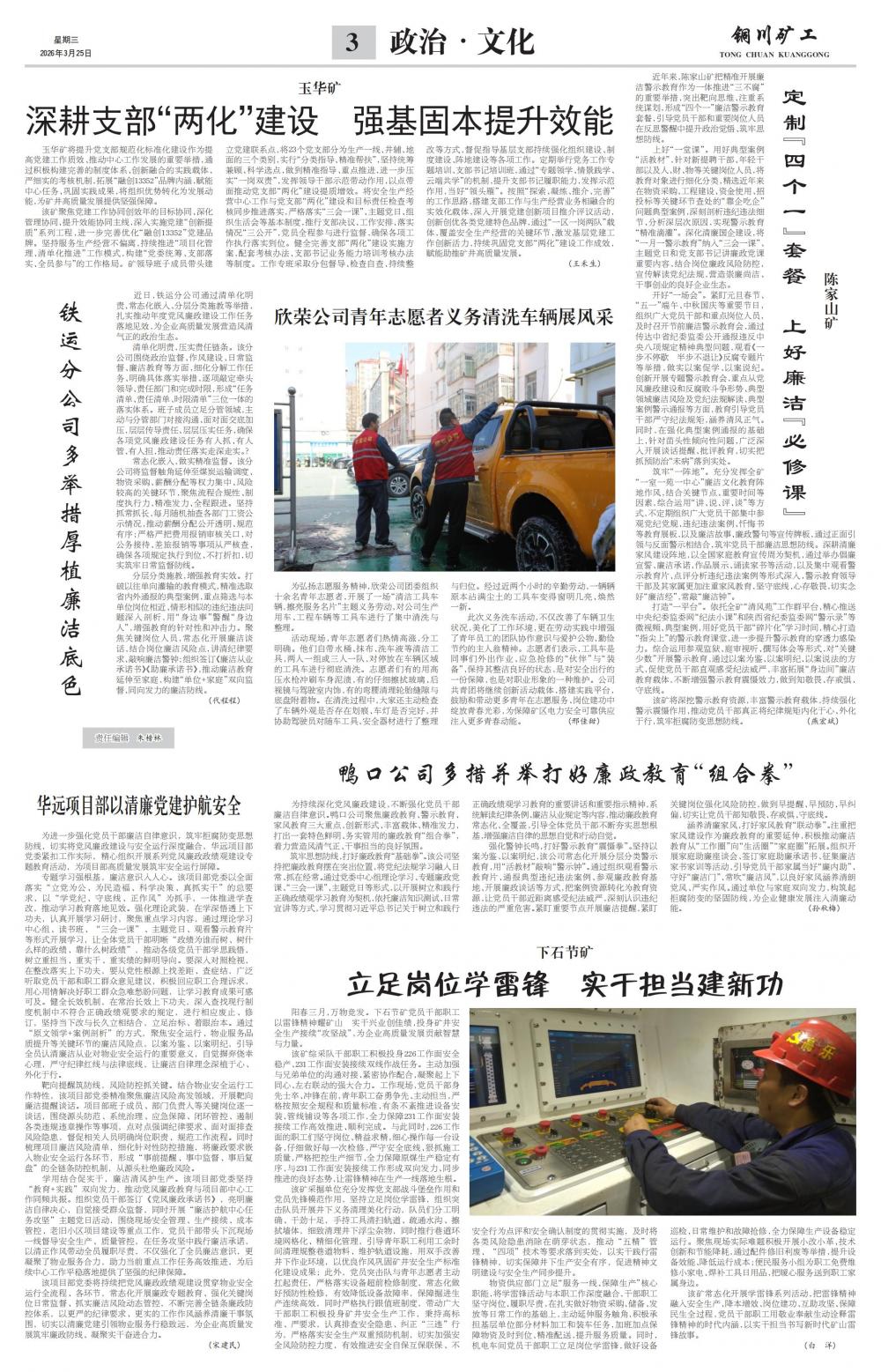 阳春三月,万物竞发。下石节矿党员干部职工以雷锋精神耀矿山 实干兴业创佳绩,投身矿井安全生产接续“攻坚战”,为企业高质量发展贡献智慧与力量。 该矿综采队干部职工积极投身226工作面安全稳产、231工作面安装接续双线作战任务。主动加强与兄弟单位的沟通对接、紧密协作配合,凝聚起上下同心、左右联动的强大合力。工作现场,党员干部身先士卒、冲锋在前,青年职工奋勇争先、主动担当,严格按照安全规程和质量标准,有条不紊推进设备安装、管线铺设等各项工作,全力保障231工作面安装接续工作高效推进、顺利完成。与此同时,226工作面的职工们坚守岗位、精益求精,细心操作每一台设备,仔细做好每一次检修,严守安全底线、狠抓施工质量,严格把控生产细节,全力保障原煤生产稳定有序,与231工作面安装接续工作形成双向发力、同步推进的良好态势,让雷锋精神在生产一线落地生根。 该矿采掘单位充分发挥党支部战斗堡垒作用和党员先锋模范作用,坚持立足岗位学雷锋,组织突击队员开展井下义务清理美化行动,队员们分工明确、干劲十足,手持工具清扫轨道、疏通水沟、擦拭墙体,细致清理井下浮尘杂物,同时推行巷道环境网格化、精细化管理,引导青年职工利用工余时间清理规整巷道物料、维护轨道设施,用双手改善井下作业环境,以优良作风巩固矿井安全生产标准化建设成果;此外,党员突击队与青年志愿者主动扛起责任,严格落实设备超前检修制度,常态化做好预防性检修,有效降低设备故障率,保障掘进生产连续高效,同时严格执行跟值班制度,带动广大干部职工积极投身矿井安全生产工作,秉持高标准、严要求,认真排查安全隐患、纠正“三违”行为,严格落实安全生产双重预防机制,切实加强安全风险防控力度,有效推进安全自保互保联保、不安全行为点评和安全确认制度的贯彻实施,及时将各类风险隐患消除在萌芽状态,推动“五精”管理、“四项”技术等要求落到实处,以实干践行雷锋精神,切实保障井下生产安全有序,促进精神文明建设与安全生产同步提升。 物资供应部门立足“服务一线、保障生产”核心职能,将学雷锋活动与本职工作深度融合,干部职工坚守岗位、履职尽责,在扎实做好物资采购、储备、发放等日常工作的基础上,主动延伸服务触角,积极承担基层单位部分材料加工和装车任务,加班加点保障物资及时到位、精准配送,提升服务质量。同时,机电车间党员干部职工立足岗位学雷锋,做好设备巡检、日常维护和故障抢修,全力保障生产设备稳定运行。聚焦现场实际难题积极开展小改小革、技术创新和节能降耗,通过配件修旧利废等举措,提升设备效能、降低运行成本;便民服务小组为职工免费维修小家电、焊补工具日用品,把暖心服务送到职工家属身边。 该矿常态化开展学雷锋系列活动,把雷锋精神融入安全生产、降本增效、岗位建功、互助攻坚、保障民生全过程,党员干部职工用敬业奉献生动诠释雷锋精神的时代内涵,以实干担当书写新时代矿山雷锋故事。