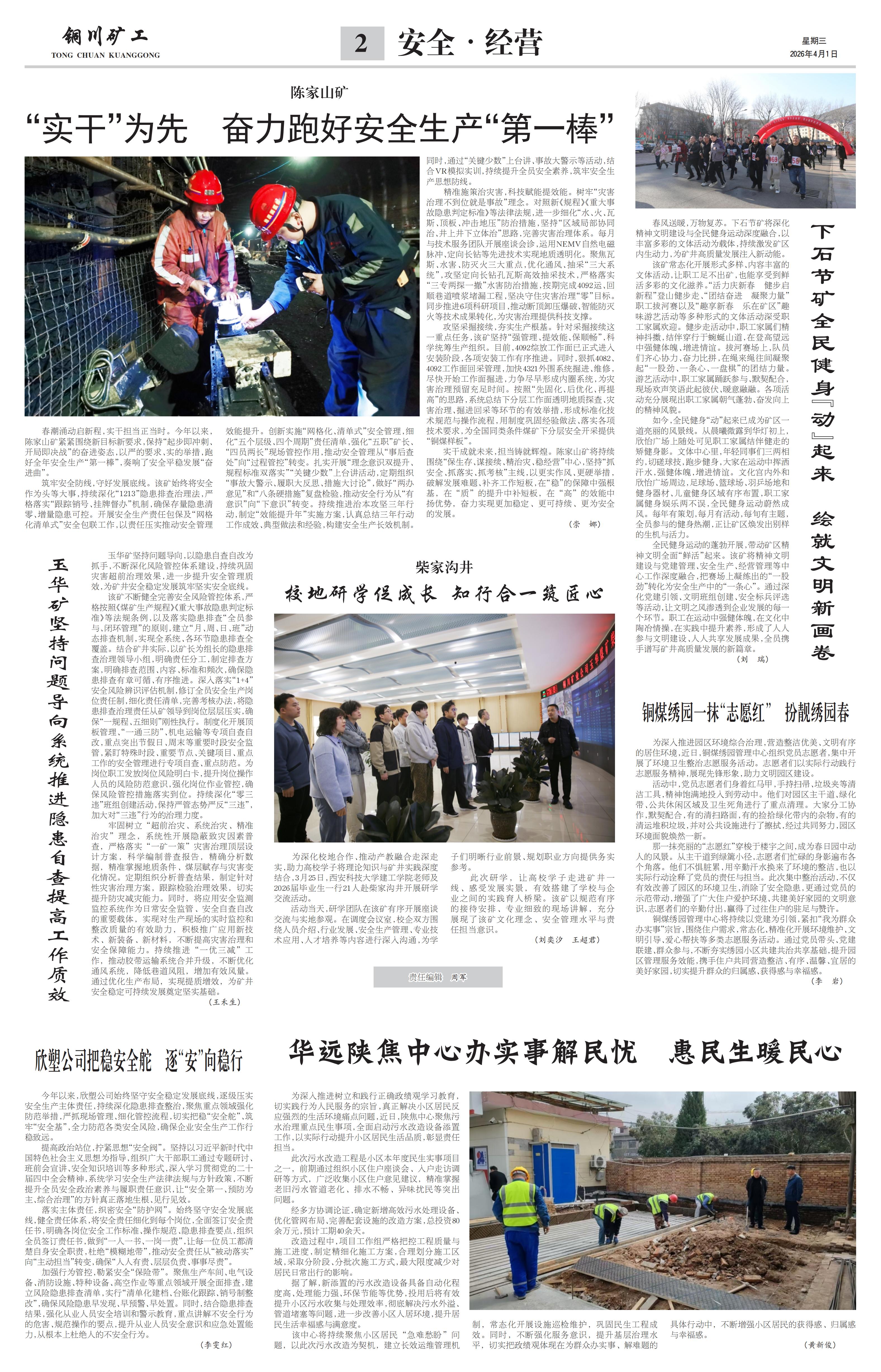 春潮涌动启新程,实干担当正当时。今年以来,陈家山矿紧紧围绕新目标新要求,保持“起步即冲刺、开局即决战”的奋进姿态,以严的要求、实的举措,跑好全年安全生产“第一棒”,奏响了安全平稳发展“奋进曲”。 筑牢安全防线,守好发展底线。该矿始终将安全作为头等大事,持续深化“1213”隐患排查治理法,严格落实“跟踪销号、挂牌督办”机制,确保存量隐患清零、增量隐患可控。开展安全生产责任包保及“网格化清单式”安全包联工作,以责任压实推动安全管理效能提升。创新实施“网格化、清单式”安全管理,细化“五个层级、四个周期”责任清单,强化“五职”矿长、“四员两长”现场管控作用,推动安全管理从“事后查处”向“过程管控”转变。扎实开展“理念意识双提升、规程标准双落实”“关键少数”上台讲活动,定期组织“事故大警示、履职大反思、措施大讨论”,做好“两办意见”和“八条硬措施”复盘检验,推动安全行为从“有意识”向“下意识”转变。持续推进治本攻坚三年行动,制定“效能提升年”实施方案,认真总结三年行动工作成效、典型做法和经验,构建安全生产长效机制。同时,通过“关键少数”上台讲、事故大警示等活动,结合VR模拟实训,持续提升全员安全素养,筑牢安全生产思想防线。 精准施策治灾害,科技赋能提效能。树牢“灾害治理不到位就是事故”理念。对照新《规程》《重大事故隐患判定标准》等法律法规,进一步细化“水、火、瓦斯、顶板、冲击地压”防治措施,坚持“区域局部协同治、井上井下立体治”思路,完善灾害治理体系。每月与技术服务团队开展座谈会诊,运用NEMV自然电磁脉冲、定向长钻等先进技术实现地质透明化。聚焦瓦斯、水害、防灭火三大重点,优化通风、抽采“三大系统”,攻坚定向长钻孔瓦斯高效抽采技术,严格落实“三专两探一撤”水害防治措施,按期完成4092运、回顺巷道喷浆堵漏工程,坚决守住灾害治理“零”目标。同步推进6项科研项目,推动断顶卸压爆破、智能防灭火等技术成果转化,为灾害治理提供科技支撑。 攻坚采掘接续,夯实生产根基。针对采掘接续这一重点任务,该矿坚持“强管理、提效能、保顺畅”,科学统筹生产组织。目前,4092综放工作面已正式进入安装阶段,各项安装工作有序推进。同时,狠抓4082、4092工作面回采管理,加快4321外围系统掘进、维修,尽快开始工作面掘进,力争尽早形成内圈系统,为灾害治理预留充足时间。按照“先固化、后优化、再提高”的思路,系统总结下分层工作面透明地质探查、灾害治理、掘进回采等环节的有效举措,形成标准化技术规范与操作流程,用制度巩固经验做法、落实各项技术要求,为全国同类条件煤矿下分层安全开采提供“铜煤样板”。 实干成就未来,担当铸就辉煌。陈家山矿将持续围绕“保生存、谋接续、精治灾、稳经营”中心,坚持“抓安全、抓落实、抓考核”主线,以更实作风、更硬举措,破解发展难题、补齐工作短板,在“稳”的保障中强根基,在“质”的提升中补短板,在“高”的效能中扬优势,奋力实现更加稳定、更可持续、更为安全的发展。
