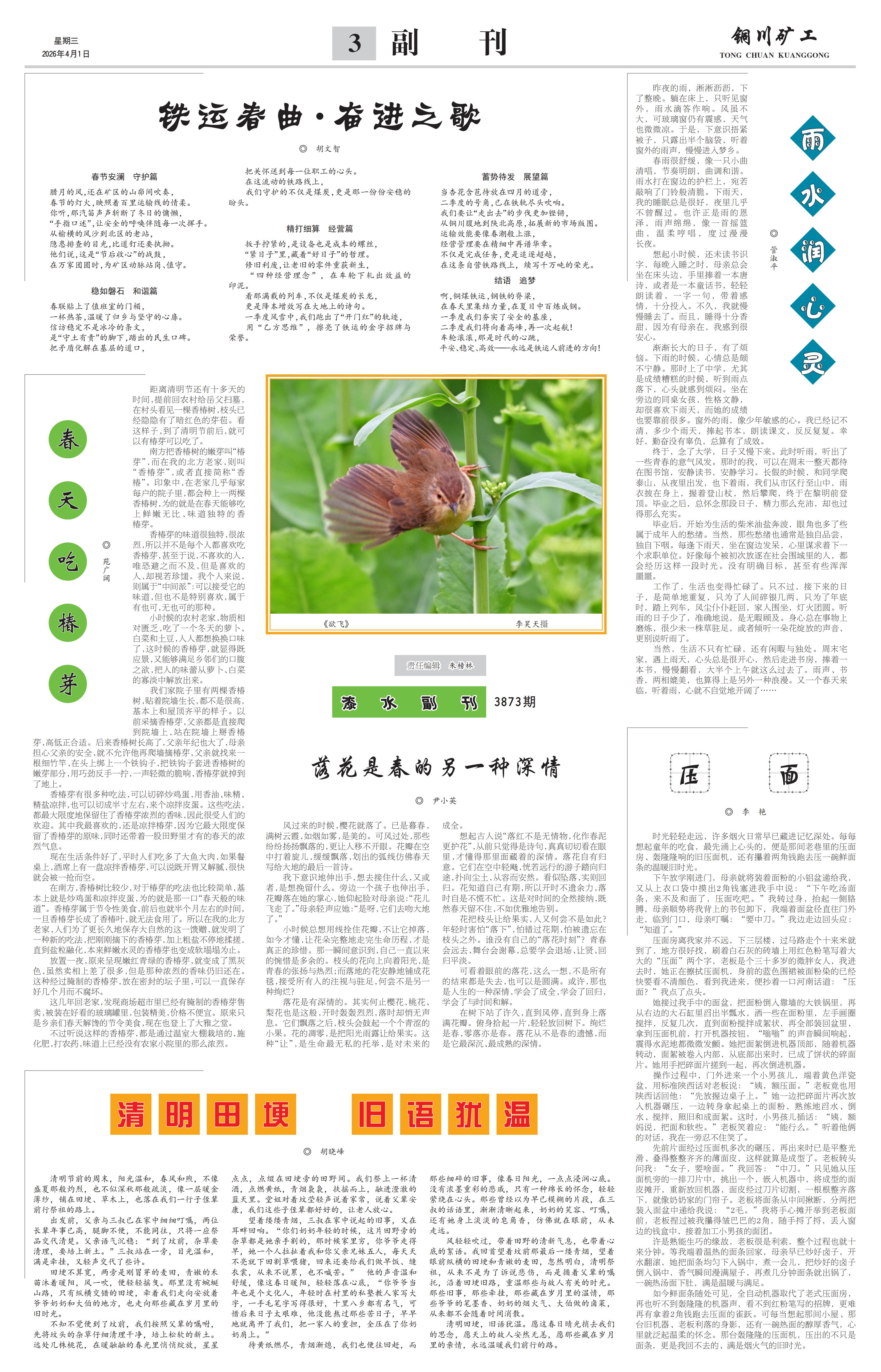 春节安澜 守护篇 腊月的风,还在矿区的山峁间吹奏, 春节的灯火,映照着百里运输线的情柔。 你听,那汽笛声声斩断了冬日的慵懒, “手指口述”,让安全的呼唤伴随每一次挥手。 从榆横的风沙到北区的老站, 隐患排查的目光,比道钉还要执拗。 他们说,这是“节后收心”的战鼓, 在万家团圆时,为矿区动脉站岗、值守。 稳如磐石 和谐篇 春联贴上了值班室的门楣, 一杯热茶,温暖了归乡与坚守的心扉。 信访稳定不是冰冷的条文, 是“守土有责”的脚下,踏出的民生口碑。 把矛盾化解在基层的道口, 把关怀送到每一位职工的心头。 在这流动的铁路线上, 我们守护的不仅是煤炭,更是那一份份安稳的盼头。 精打细算 经营篇 扳手拧紧的,是设备也是成本的螺丝, “紧日子”里,藏着“好日子”的哲理。 修旧利废,让老旧的零件重获新生, “四种经营理念”,在车轮下轧出效益的印泥。 看那满载的列车,不仅是煤炭的长龙, 更是降本增效写在大地上的诗句。 一季度风雪中,我们跑出了“开门红”的轨迹, 用“乙方思维”,擦亮了铁运的金字招牌与荣誉。 蓄势待发 展望篇 当杏花含苞待放在四月的道旁, 二季度的号角,已在铁轨尽头吹响。 我们要让“走出去”的步伐更加铿锵, 从铜川腹地到陕北高原,拓展新的市场版图。 运输效能要像春潮般上涨, 经营管理要在精细中再谱华章。 不仅是完成任务,更是追逐超越, 在这条自营铁路线上,续写千万吨的荣光。结语 追梦 啊,铜煤铁运,钢铁的脊梁, 在春天里集结力量,在夏日中百炼成钢。 一季度我们夯实了安全的基座, 二季度我们将向着高峰,再一次起航! 车轮滚滚,那是时代的心跳, 平安、稳定、高效——永远是铁运人前进的方向!
