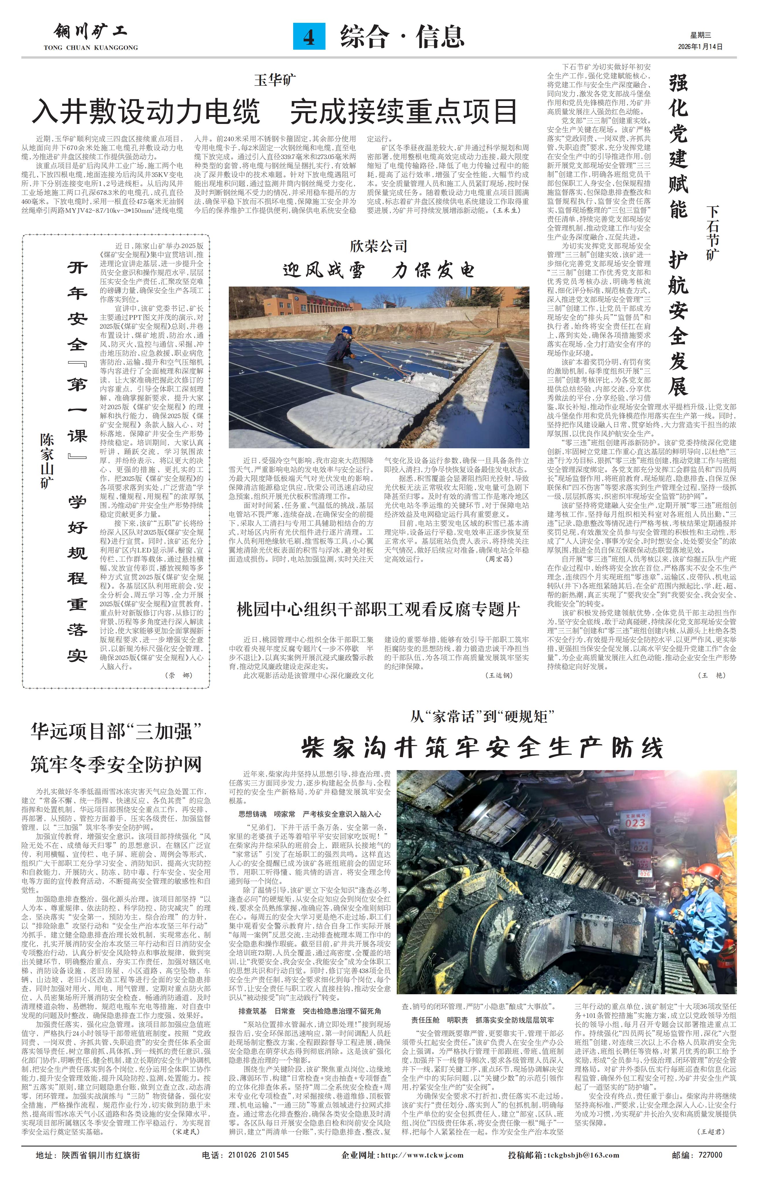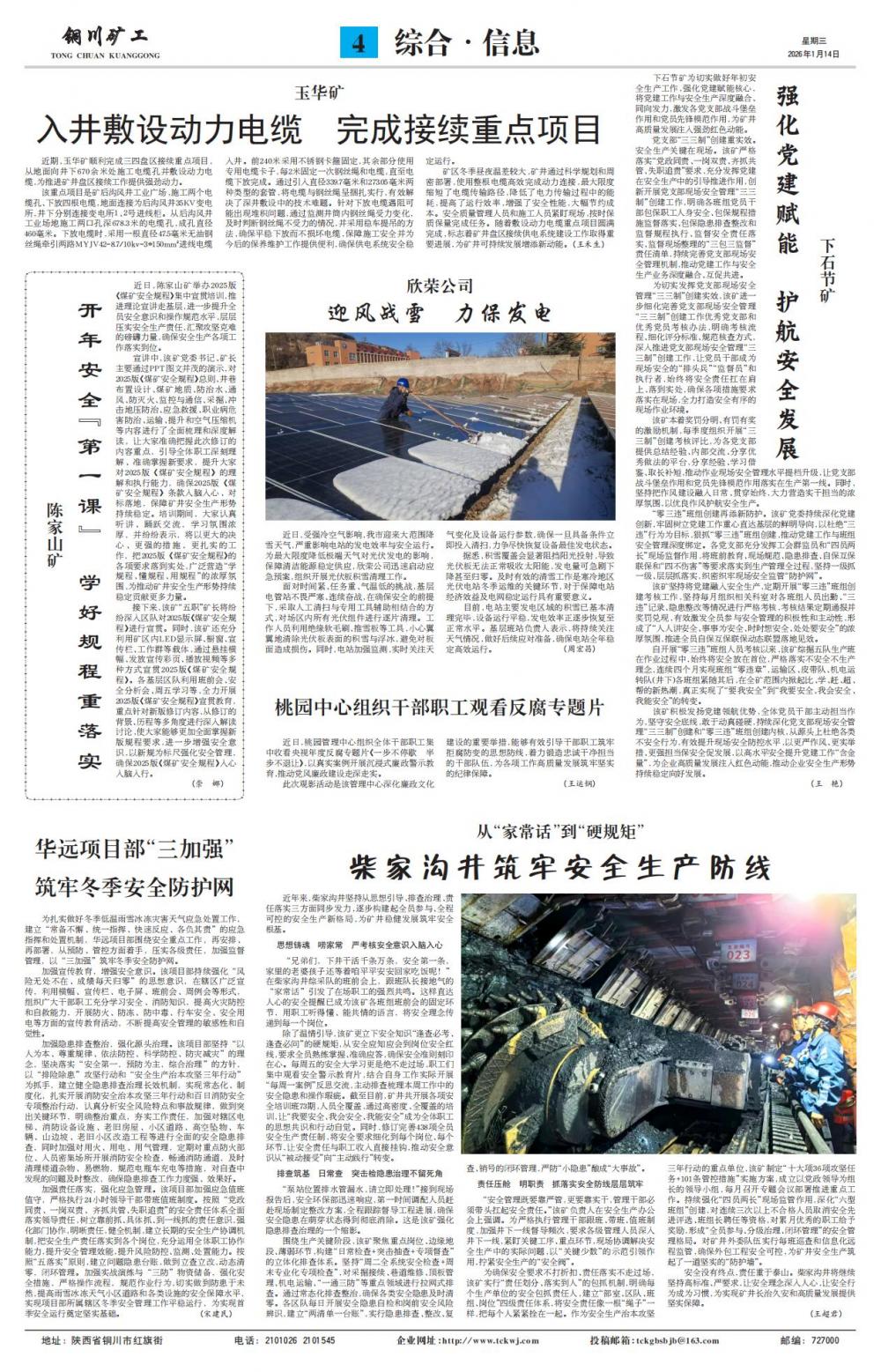 近年来,柴家沟井坚持从思想引导、排查治理、责任落实三方面同步发力,逐步构建起全员参与、全程可控的安全生产新格局,为矿井稳健发展筑牢安全根基。思想铸魂 唠家常 严考核安全意识入脑入心“兄弟们,下井干活千条万条,安全第一条,家里的老婆孩子还等着咱平平安安回家吃饭呢!”在柴家沟井综采队的班前会上,跟班队长接地气的“家常话”引发了在场职工的强烈共鸣。这样直达人心的安全提醒已成为该矿各班组班前会的固定环节,用职工听得懂、能共情的语言,将安全理念传递到每一个岗位。除了温情引导,该矿更立下安全知识“逢查必考、逢查必问”的硬规矩,从安全应知应会到岗位安全红线,要求全员熟练掌握、准确应答,确保安全准则刻印在心。每周五的安全大学习更是绝不走过场,职工们集中观看安全警示教育片,结合自身工作实际开展“每周一案例”反思交流,主动排查梳理本周工作中的安全隐患和操作瑕疵。截至目前,矿井共开展各项安全培训班73期,人员全覆盖,通过高密度、全覆盖的培训,让“我要安全、我会安全、我能安全”成为全体职工的思想共识和行动自觉。同时,修订完善438项全员安全生产责任制,将安全要求细化到每个岗位、每个环节,让安全责任与职工收入直接挂钩,推动安全意识从“被动接受”向“主动践行”转变。排查筑基 日常查 突击检隐患治理不留死角“泵站位置排水管漏水,请立即处理!”接到现场报告后,安全环保部迅速响应,第一时间调配人员赶赴现场制定整改方案,全程跟踪督导工程进展,确保安全隐患在萌芽状态得到彻底消除。这是该矿强化隐患排查治理的一个缩影。围绕生产关键阶段,该矿聚焦重点岗位、边缘地段、薄弱环节,构建“日常检查+突击抽查+专项督查”的立体化排查体系。坚持“周二全系统安全检查+周末专业化专项检查”,对采掘接续、巷道维修、顶板管理、机电运输、“一通三防”等重点领域进行拉网式排查。通过常态化排查整治,确保各类安全隐患及时清零。各区队每日开展安全隐患自检和岗前安全风险辨识,建立“两清单一台账”,实行隐患排查、整改、复查、销号的闭环管理,严防“小隐患”酿成“大事故”。责任压舱 明职责 抓落实安全防线层层筑牢“安全管理既要靠严管,更要靠实干,管理干部必须带头扛起安全责任。”该矿负责人在安全生产办公会上强调。为严格执行管理干部跟班、带班、值班制度,加强井下一线督导频次,要求各级管理人员深入井下一线,紧盯关键工序、重点环节,现场协调解决安全生产中的实际问题,以“关键少数”的示范引领作用,拧紧安全生产的“安全阀”。为确保安全要求不打折扣、责任落实不走过场,该矿实行“责任划分、落实到人”的包抓机制,明确每个生产单位的安全包抓责任人,建立“部室、区队、班组、岗位”四级责任体系,将安全责任像一根“绳子”一样,把每个人紧紧拴在一起。作为安全生产治本攻坚三年行动的重点单位,该矿制定“十大项36项攻坚任务+101条管控措施”实施方案,成立以党政领导为组长的领导小组,每月召开专题会议部署推进重点工作。持续强化“四员两长”现场监管作用,深化“六型班组”创建,对连续三次以上不合格人员取消安全先进评选、班组长聘任等资格,对累月优秀的职工给予奖励,形成“全员参与、分级治理、闭环管理”的安全管理格局。对矿井外委队伍实行每班巡查和信息化远程监管,确保外包工程安全可控,为矿井安全生产筑起了一道坚实的“防护墙”。安全没有终点,责任重于泰山。柴家沟井将继续坚持高标准、严要求,让安全理念深入人心,让安全行为成为习惯,为实现矿井长治久安和高质量发展提供坚实保障。